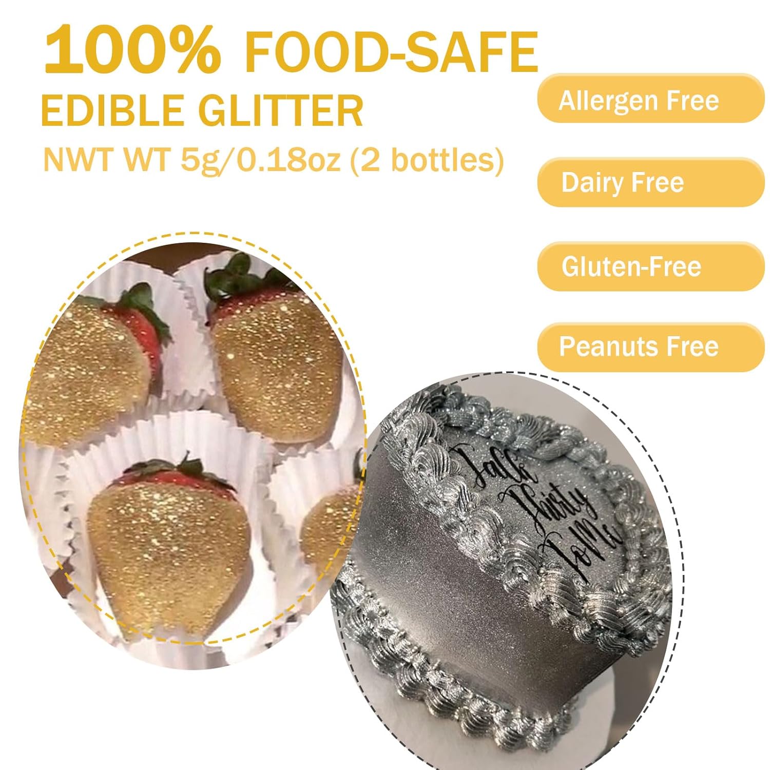 - Easy to Use: Colaele gold edible glitter for strawberries is easy to use. Beginner friendly and all you need to do is sprinkle it on! Edible glitter also can be shared to decorations or used spray gun for smoothing. Sprinkle on Sparkle and Luster to Sweets for your cake or sugar art to add luxury luster effects