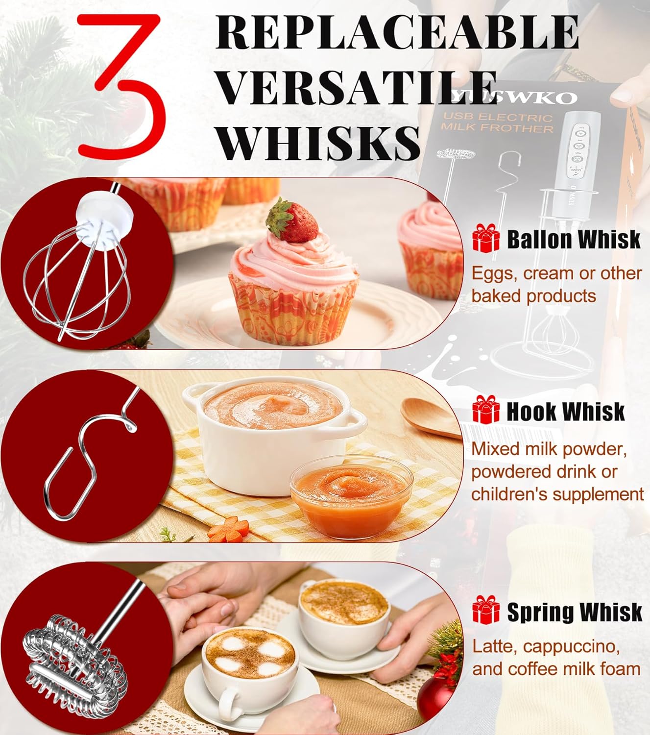 - 🔥【3 REPLACEABLE STAINLESS WHISKS】3 detachable whisk heads are included in this coffee stirrer. Type U of coffee frother is suitable for mixed milk powder and supplements for children. The mesh type is suitable for a latte, cappuccino, and coffee. There is also a model specific to baking. Easily switch to use, suitable for a variety of kitchen use scenarios.