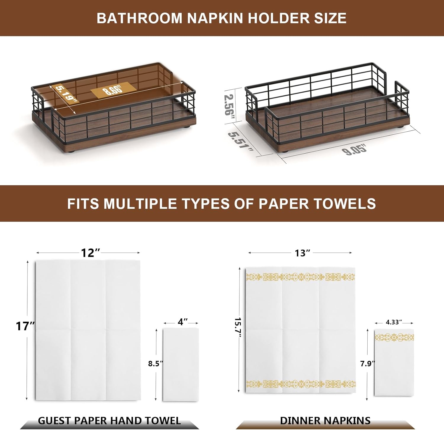 Wican Guest Towel Holder Tray for Bathroom, Oak and Iron Napkins Holder for Powder Room Dinning Table Wooden Basket for Disposable Paper Hand Towels Black & Walnut