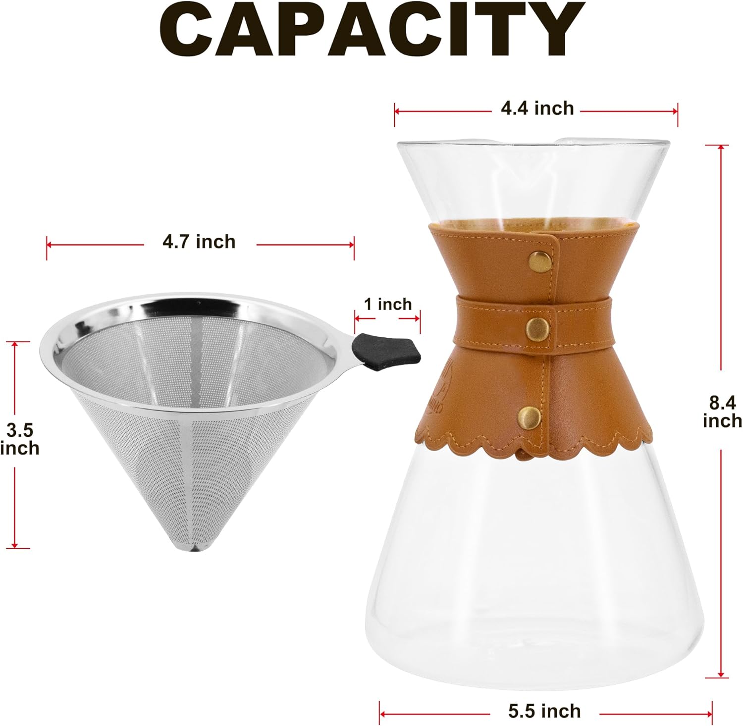 34oz Pour Over Coffee Maker with Double Layer Stainless Steel Filter, Borosilicate Glass Dripper, Detachable Heat-Resistant Leather Pad 7-8 Cups Coffee Maker Carafe(Light brown)