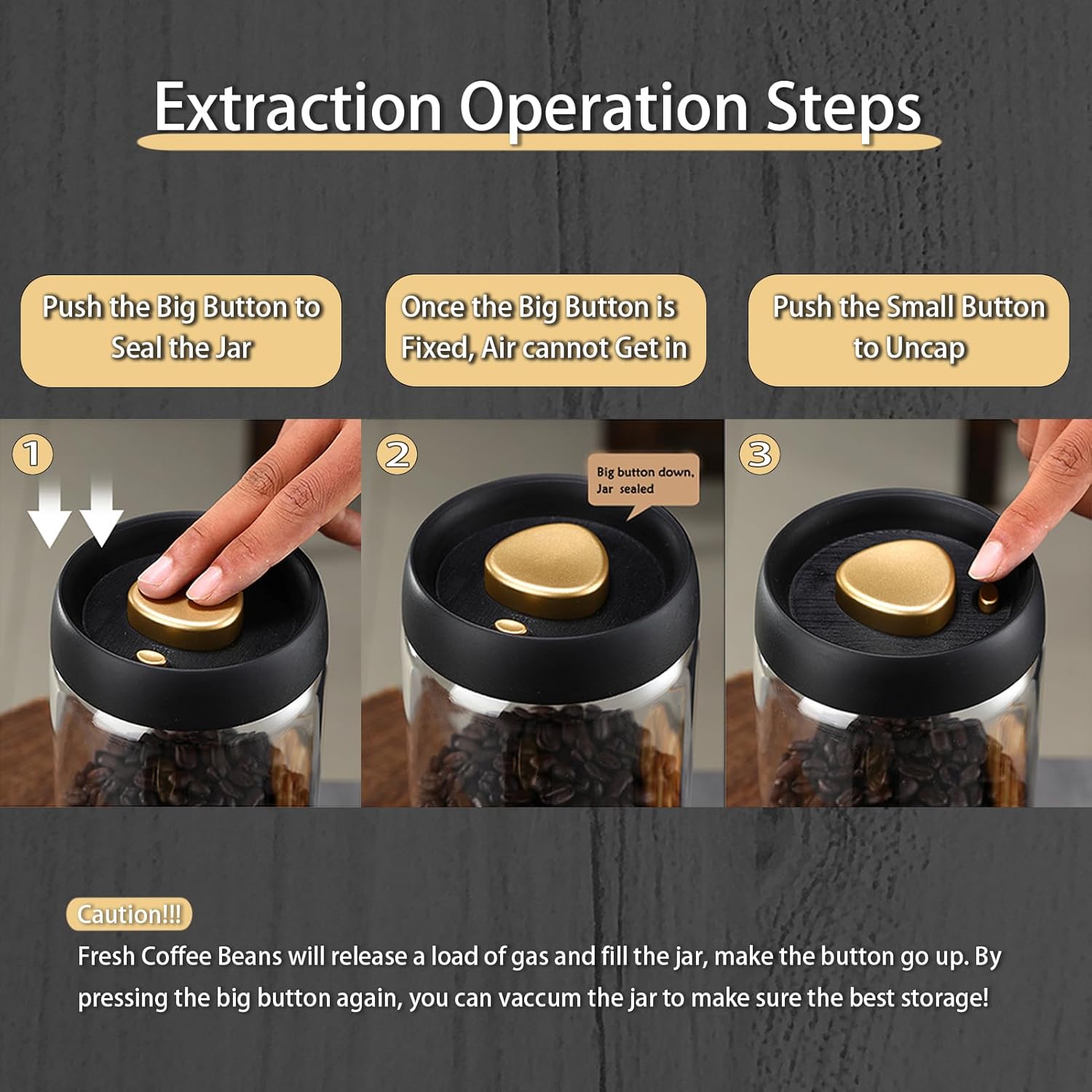 - Caution!!! Fresh Coffee Beans will release a load of gas and fill the jar, make the button go up. By pressing the big button again, you can vaccum the jar to make sure the best sotrage!