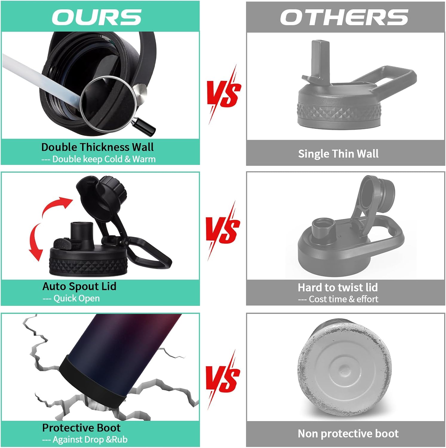 - QUALITY VACUUM INSULATION: Metal water bottle featuring double-wall & food-grade 18/8 stainless steel with superior insulation & anti-condensation, keeping your beverages stay ICE COLD for 48-Hours & HOT for 24-Hours for a fresh taste. In addition, the outer layer with non-slip powder coating ensures drinking bottles won't sweat & that keeps it from slipping