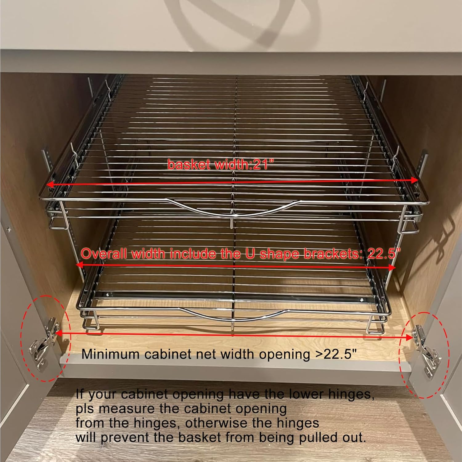 - 👍【Product Size】DINDON 2 tier pull out cabinet organizer --- 👍Overall Size is 22-1/2“ W x 21-1/2"D x 15"H, this size refer to the maximum width Including the U-shape brackets, 👍 Actual The Basket Size is 21"W x 21-1/2" D x2-3/8”H. Fits cabinet with more than 22-1/2“ W clearance between door hinges or larger. Min cabinet interior depth: 23 inch. If your cabinet has hinges, measure the width from the hinges, otherwise the hinges will prevent the basket from being pulled out.