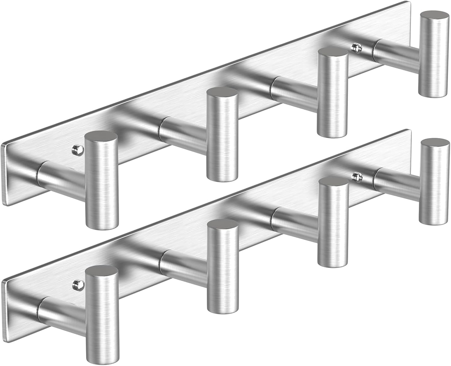 VAEHOLD Silver Hat and Coat Wall Mount Rack - Coat Rack with 4 Hooks for Robes, Bags, Keys, and Towels - Bathroom Towel Hanger Organizer (2 Pack)