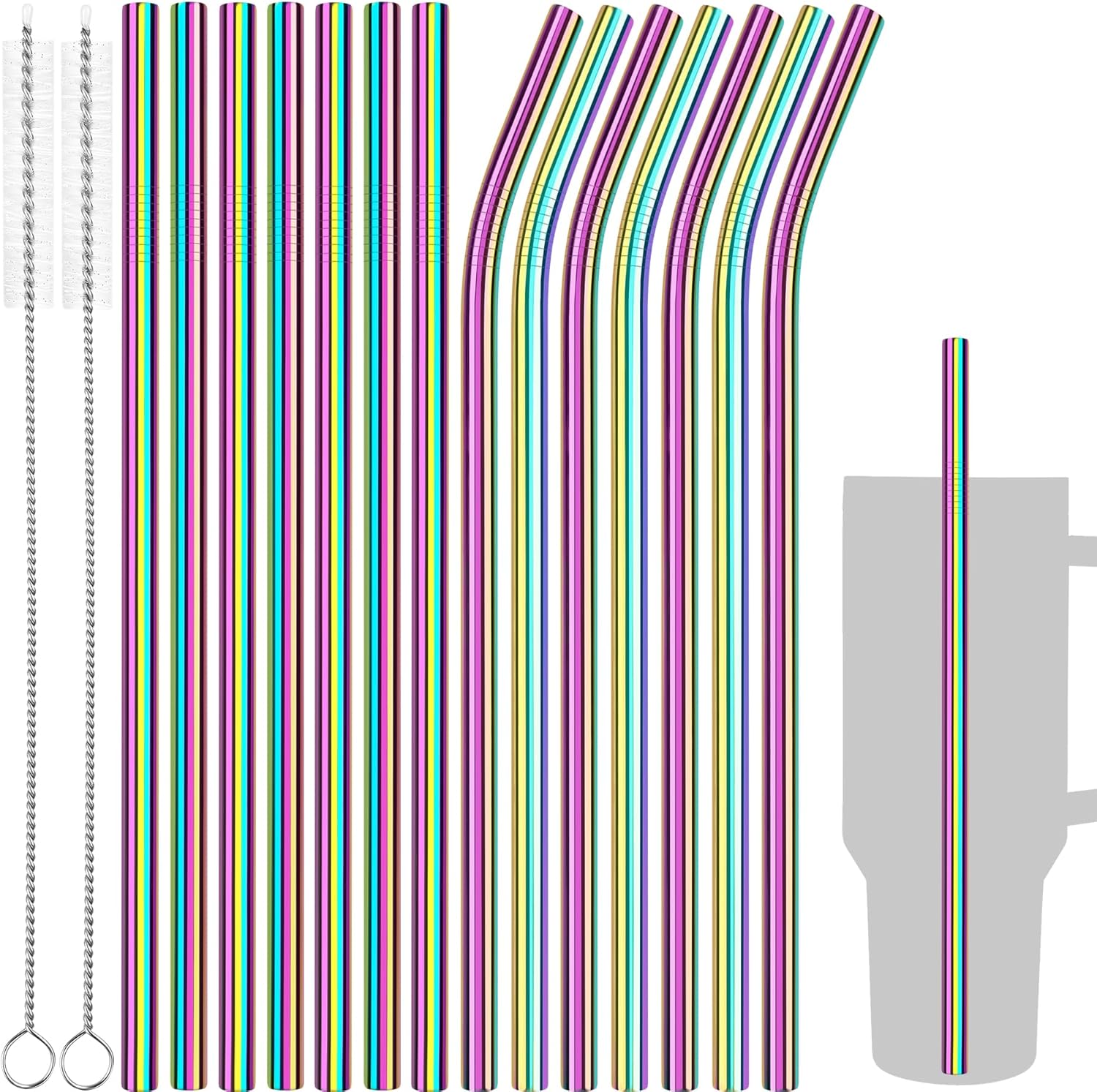 Tomorotec 11 Inch Stainless Steel Reusable Drinking Straws 14PCS & 2 Cleaning Brushes Set with Curved & Straight Designs, Compatible with 30oz Stanley Tumblers, Dishwasher Safe, BPA-Free (Metallic)