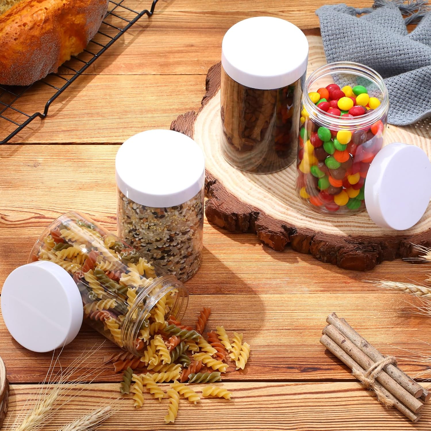 - What you receive: there are 4 pieces plastic jars with white screw-on lids. They are reliable and refillable, measuring about 12 oz in capacity