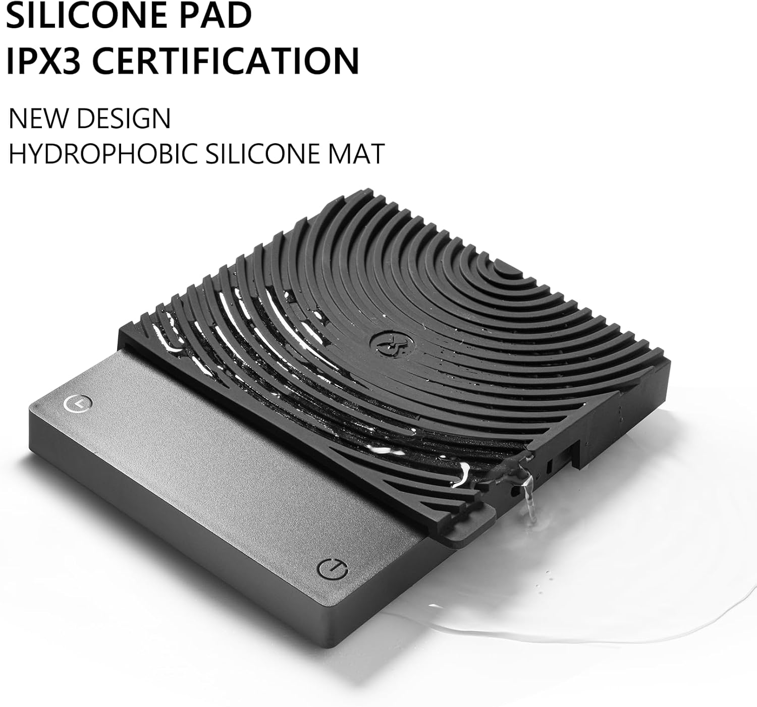 - [ Superior Materials ] Constructed with high-quality acrylic, this digital kitchen scale is ultra compact and low-profile but fairly durable. Note: The dial surface is waterproof, and the charging port is upgraded to a closable design, solving the trouble of liquid entering the charging port. Included a silicone insulation waterproof pad