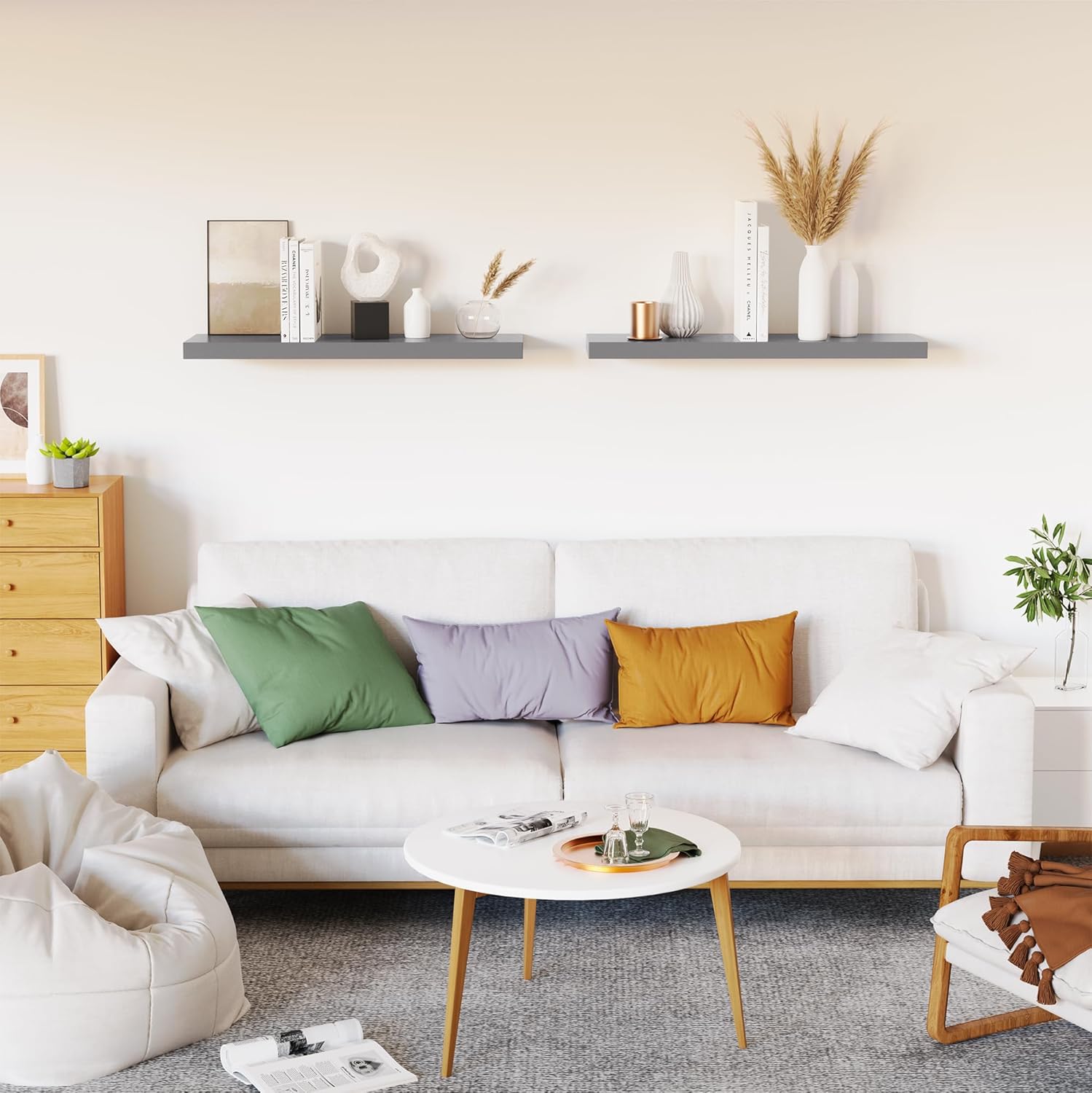 - 【Versatile & Functional】Our gray floating shelves for wall can simplify our life which let everything will be in reach. Our wall shelf is a perfect space to display our family pictures, books, memorandums, charming antiques or artwork, spices or jars and fresh green plant. Our floating shelf wood not only give us extra storage but also improve the beauty of our home decor. Our gray shelves can be perfectly integrated and decorated in the bathroom, kitchen, living room, bedroom and other place.