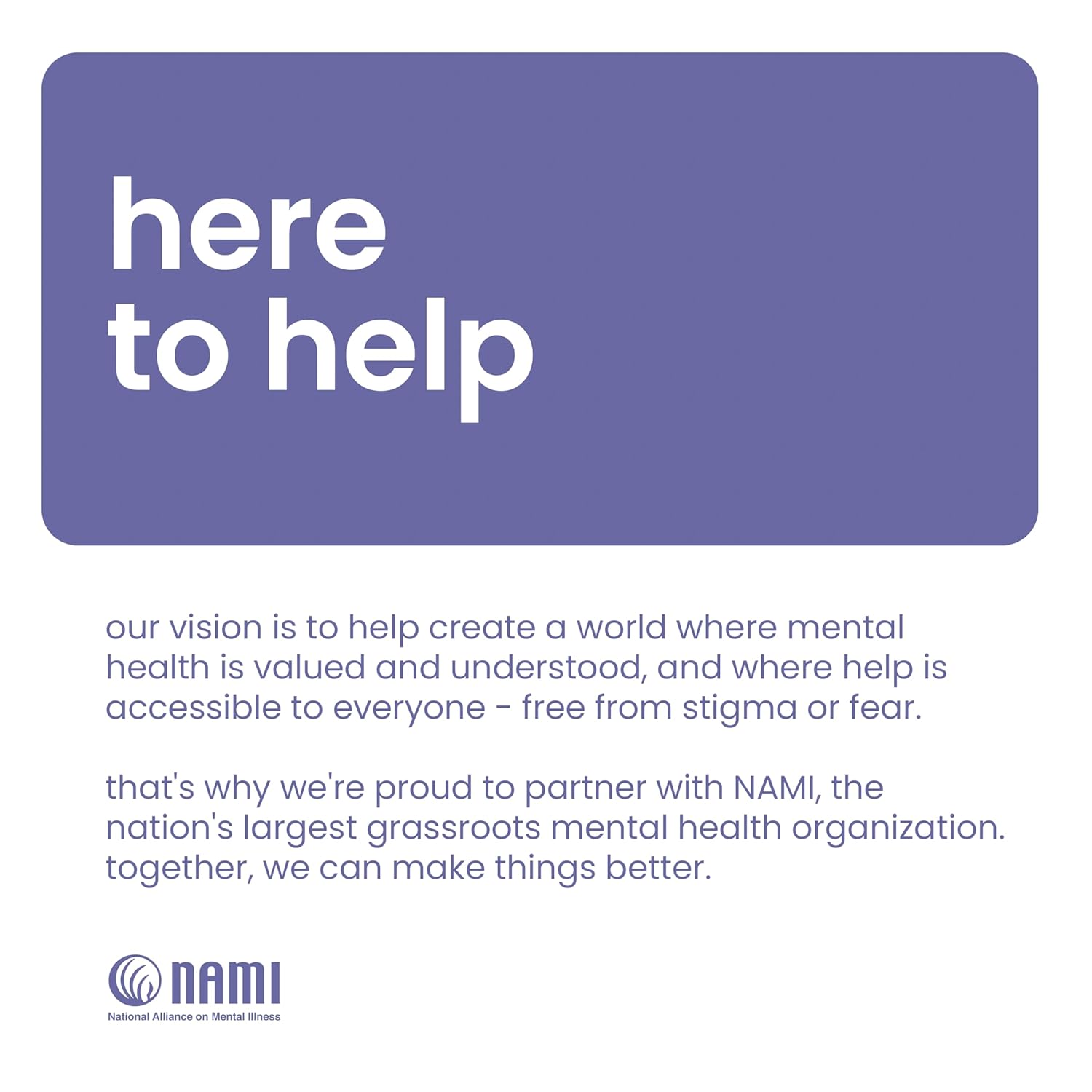 - together, we can make things better: we've partnered with NAMI, the largest mental health organization in the US, to provide meaningful support wherever you are. NAMI is dedicated to building better lives for the millions affected by mental illness.