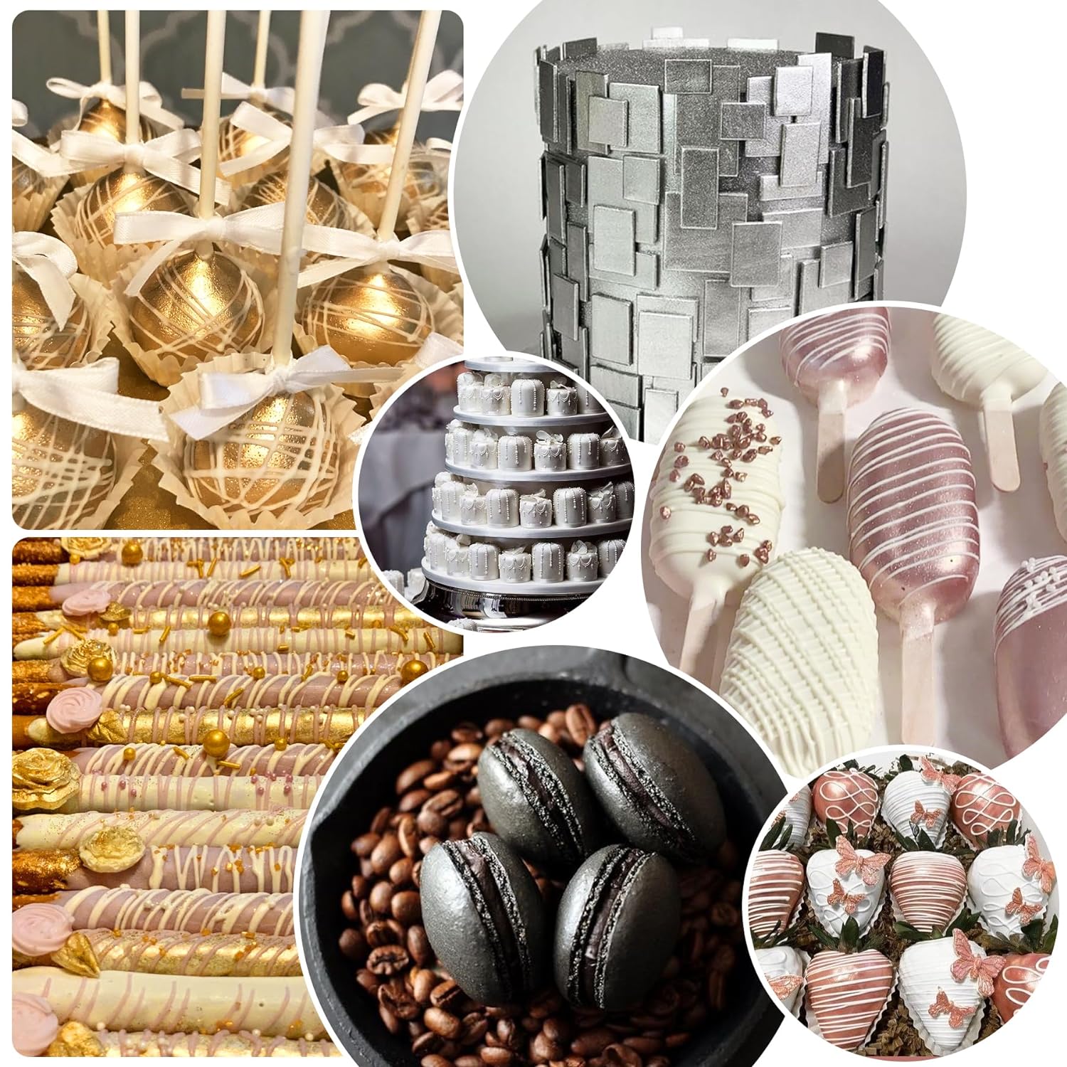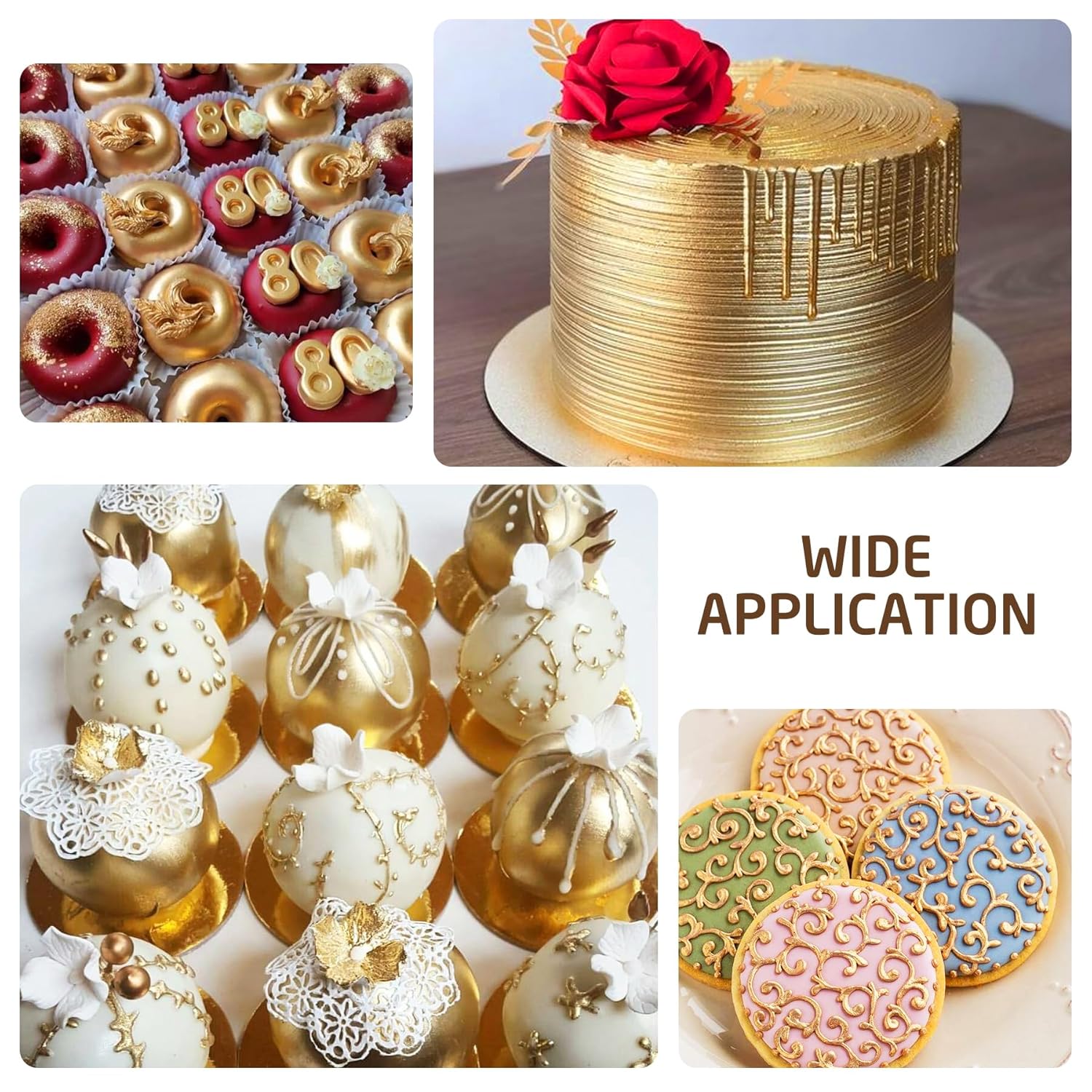 - WIDE RANGE OF USES - This food grade cake paints can add a luxury shimmer to cakes decorating, cookies, macarons, chocolate, fondant, and other baked goods. Perfect for on various occasions such as Valentine's Day, anniversaries, birthdays, Easter Christmas, Halloween, and Thanksgiving Day. Discover an unlimited world of creative metallic color.