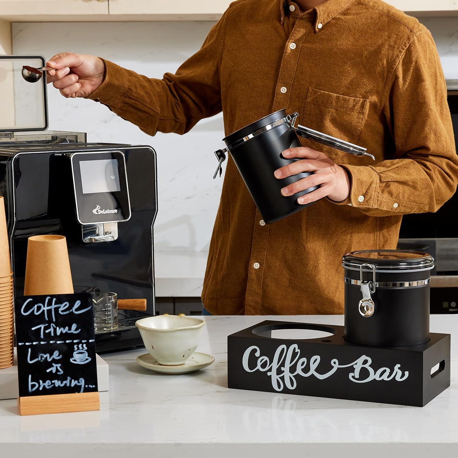 - KEEP THE DESKTOP TIDY: The coffee Containers set includes a wooden storage shelf and a Silver iron coffee spoon, which not only facilitates users to organize and categorize similar foods, make the desktop more tidy, and use the cans more conveniently, but also can decorate your desktop and let Your desktop is no longer monotonous.