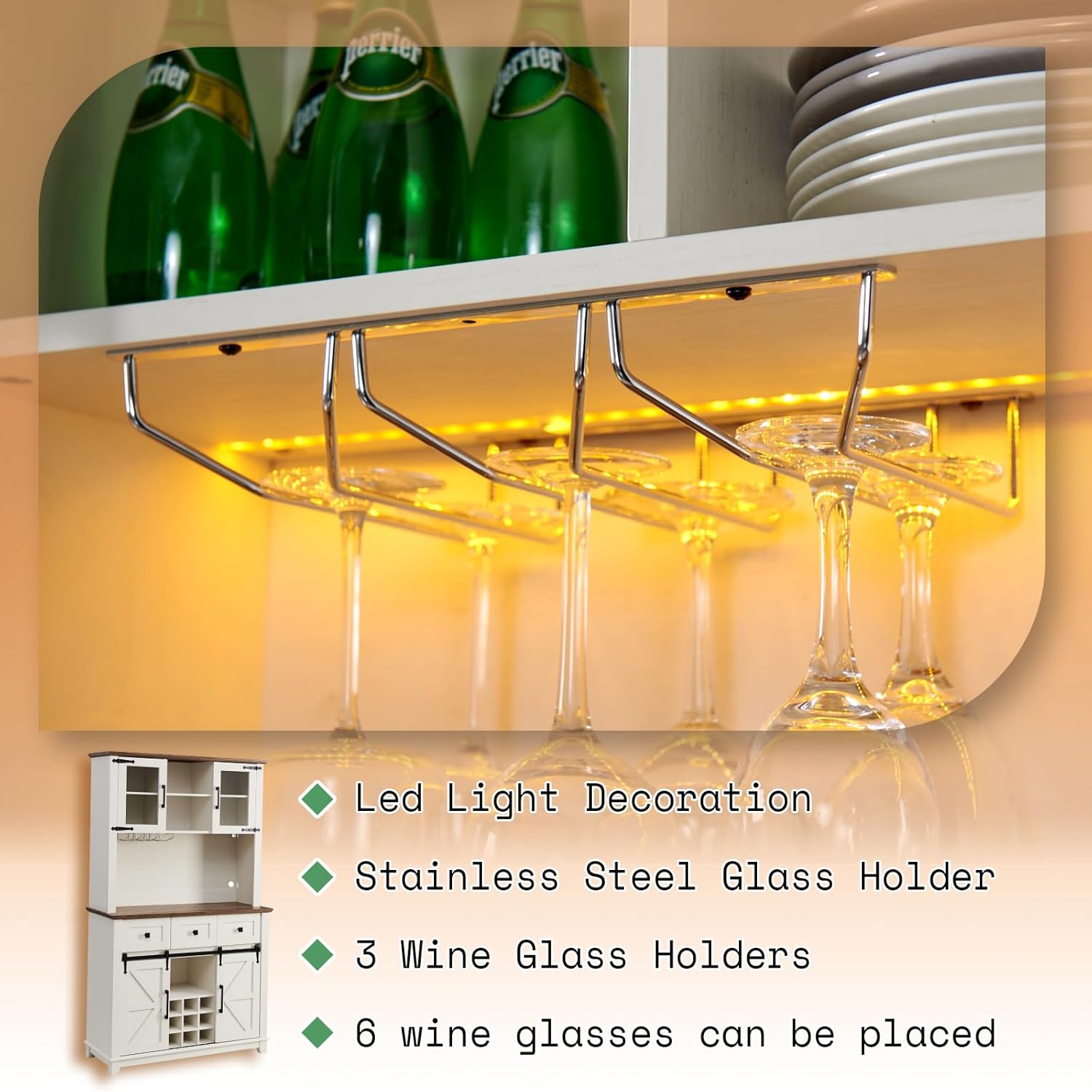 - Coffee Bar: The farmhous bar with smooth sliding barn door combines retro and classic. Enhance your home with 3 wine glass holders, allowing for the elegant display of up to 6 red wine glasses. Each cabinet features adjustable shelves, providing a customizable and versatile storage solution tailored to your needs.