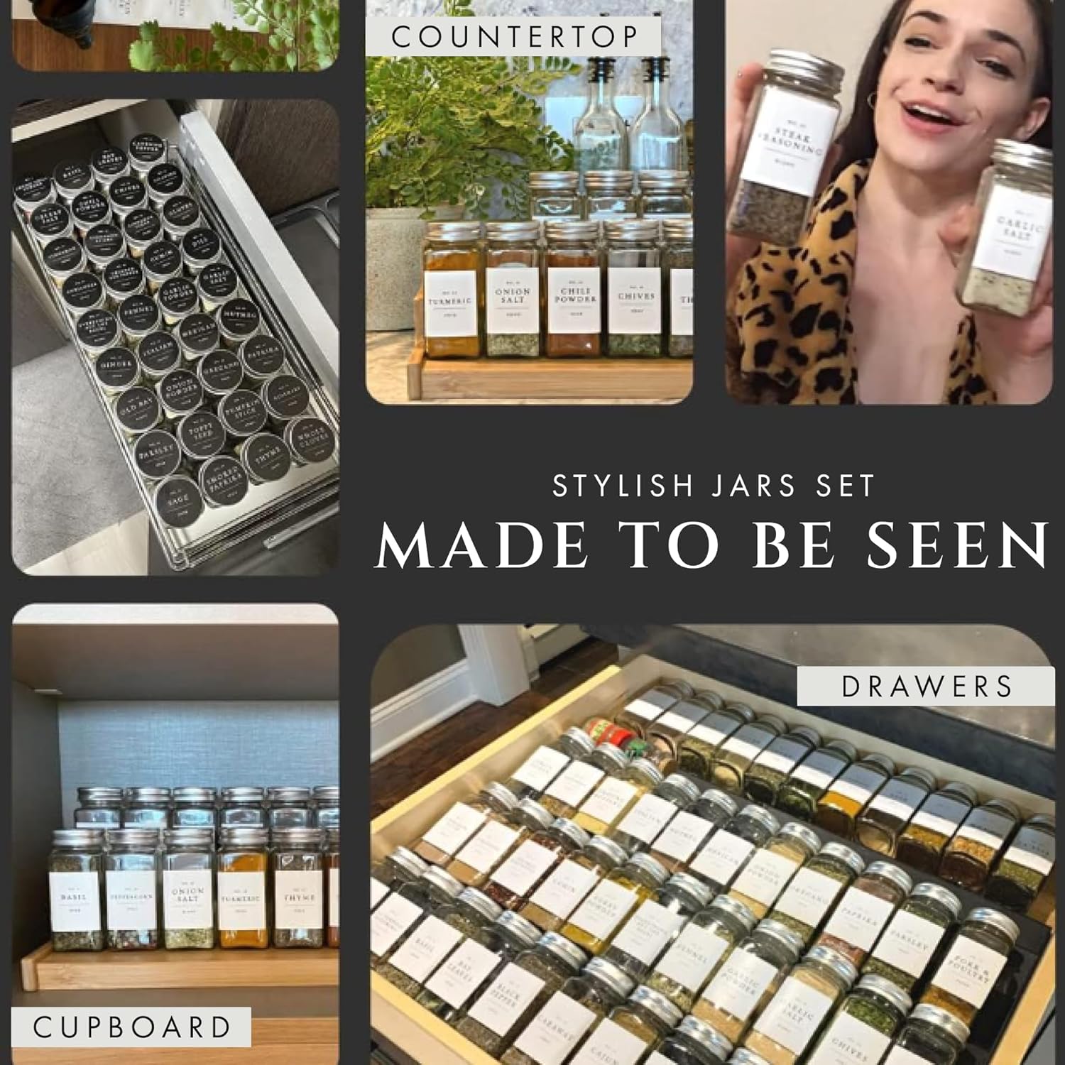 - STRONG PERFECTLY SIZED GLASS JARS: Crafted from thick, durable glass, each glass spice jar is perfectly sized for ample spice storage. This spice jar set is designed to fit seamlessly into any drawer, pantry, or cabinet, optimizing both space and convenience in your kitchen