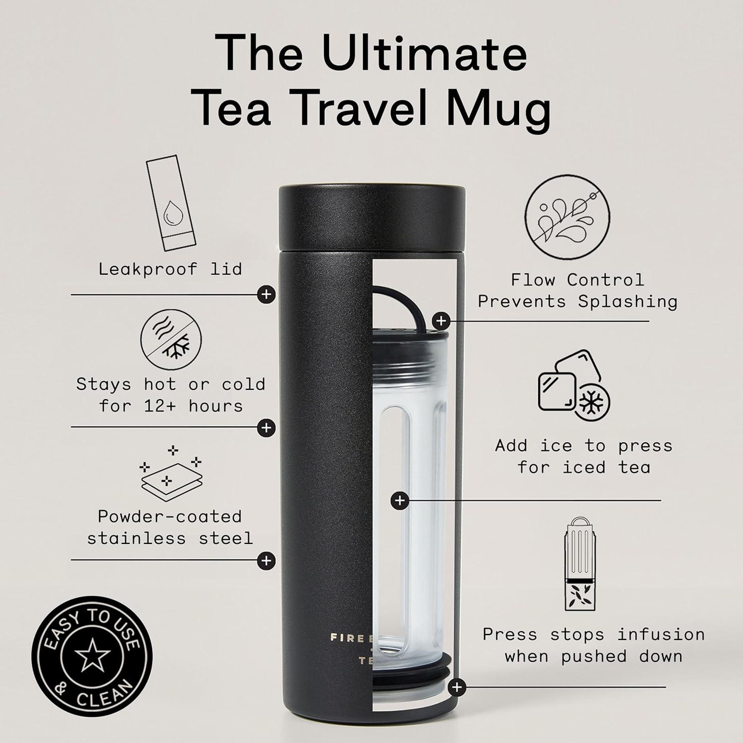 Firebelly Tea, Travel Tea Infuser Mug with Strainer, Insulated Tumbler for Loose Leaf Tea or Coffee, Leakproof Bottle for Hot or Iced Drinks, Stainless Steel Thermos with Lid, Noir