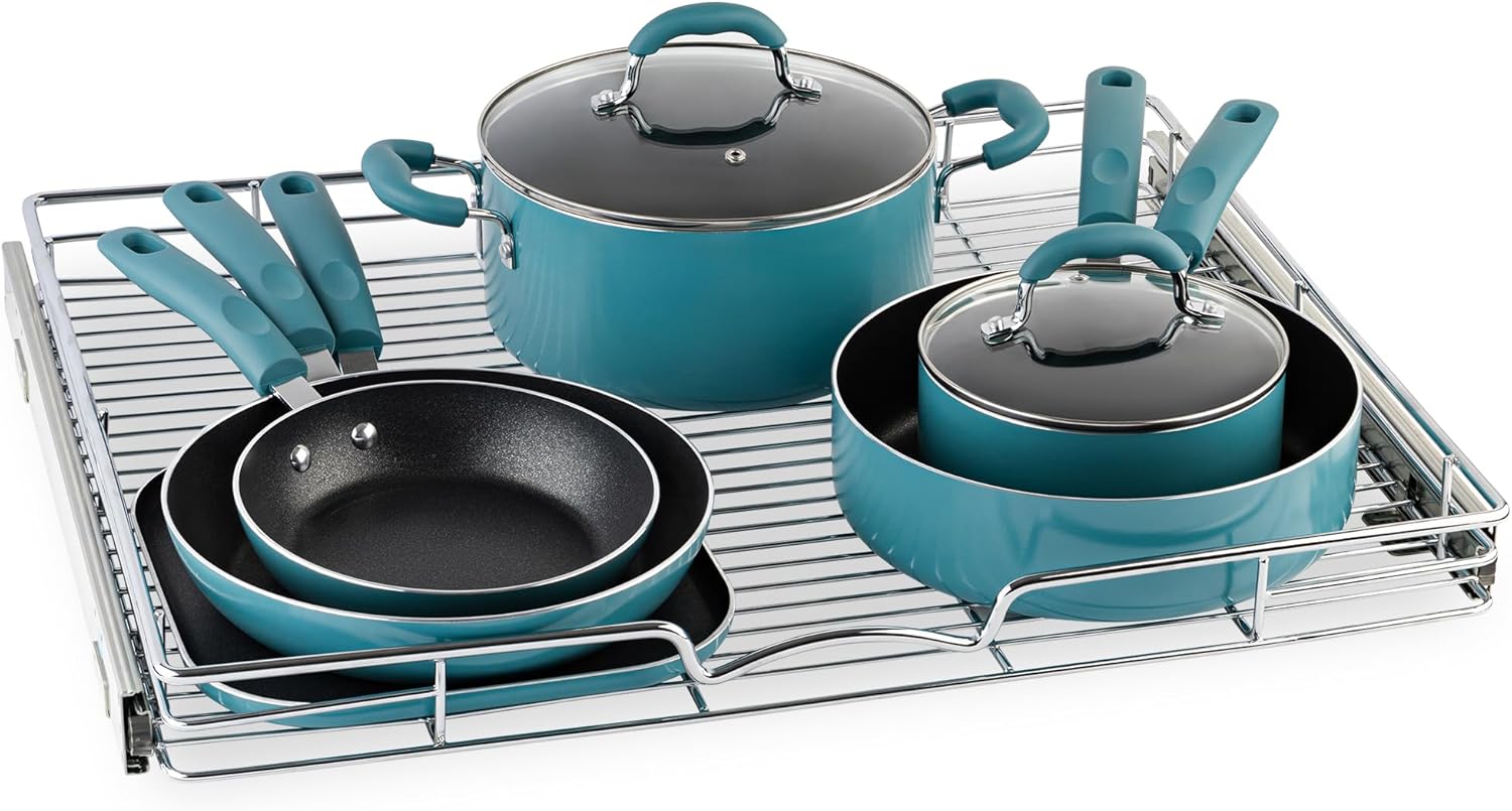 - HIGH QUALITY: Made of durable metal with chrome finish the pull out shelf for kitchen cabinet is simple and easy to install. Designed to fit any style of cabinetry and easy to clean.