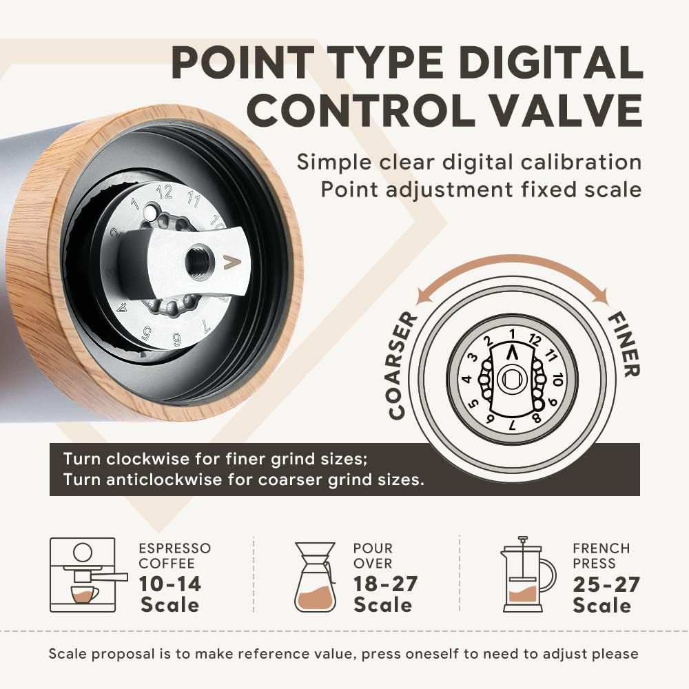 - *The Slow Grind speed:Compared to automatic ones, the grinding process hardly generates heat, which completely preserves the original taste of coffee beans & maintains rich and original aroma, giving you a more perfect coffee flavor.