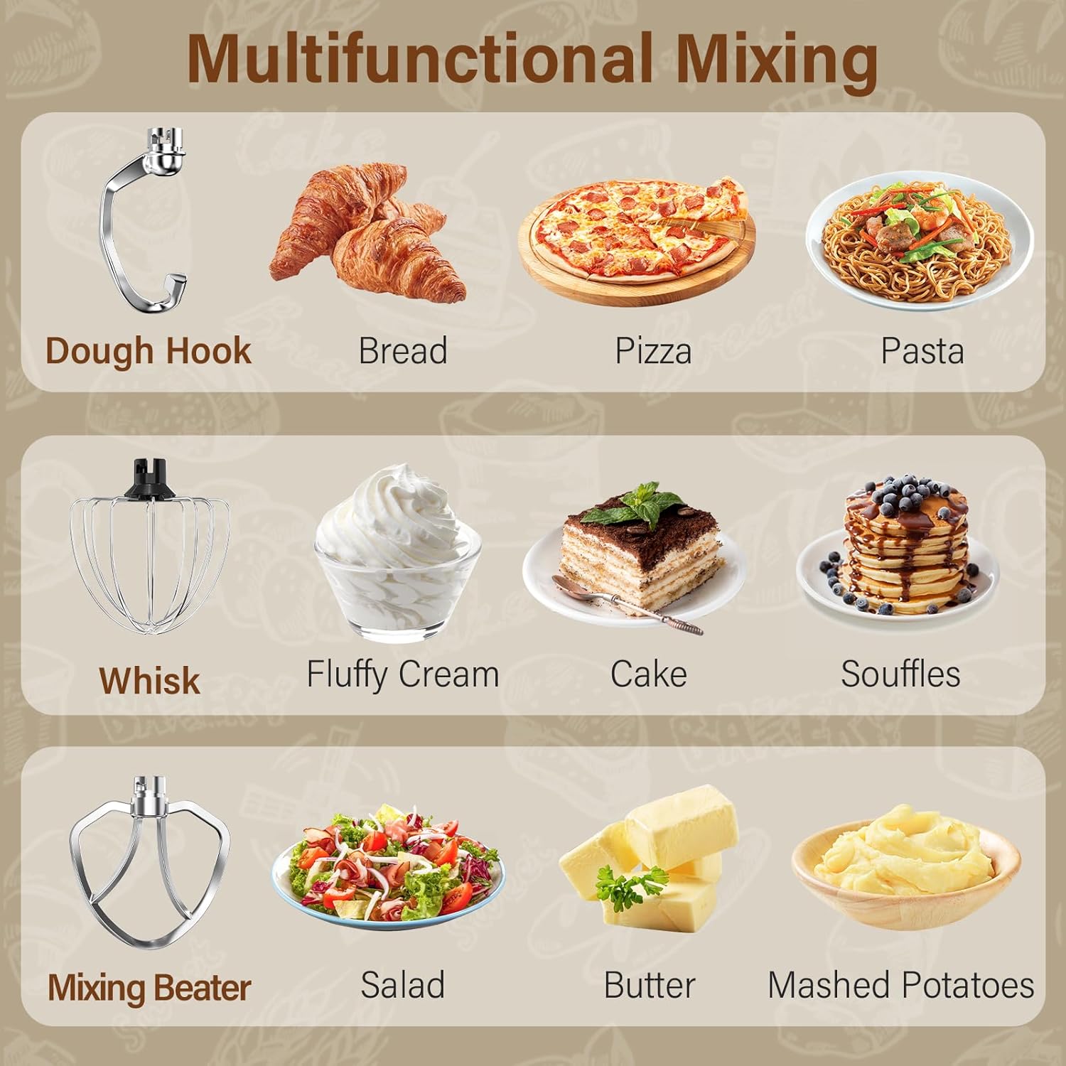 - VARIABLE SPEED----With 10 speeds to choose from, the mini mixer is big on function and meets all your kitchen needs. One-touch head-tilt makes it easy to add or take food. Anti-slip suction feet maintain dough mixer stability and keep you safe.