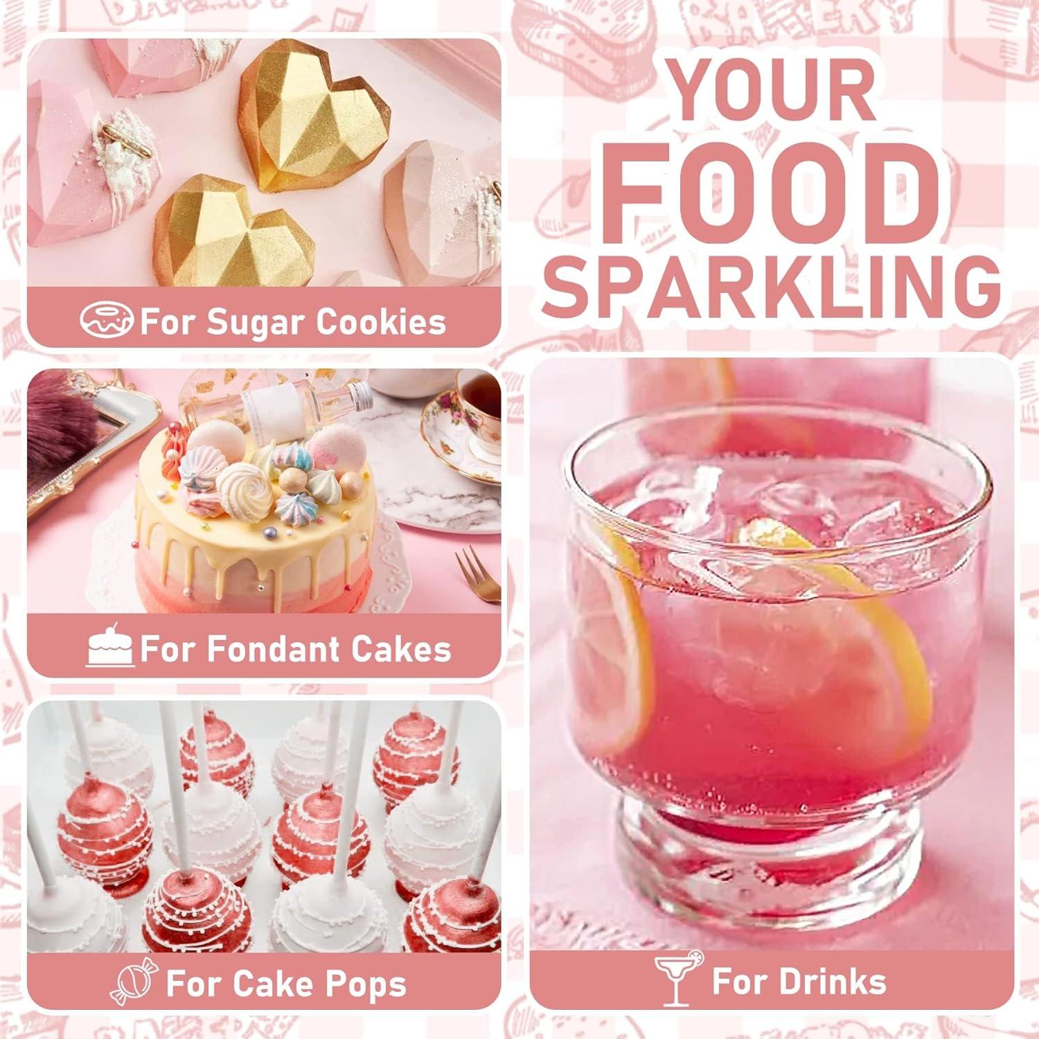 - SHIMMERY EDIBLE LUSTER DUST - Specially crafted for food decoration and craft industries to get a metallic finish or add a gold-plated effect. This fine texture dust powder creates a shimmer result that provides a high luster glitter effect to your foods and drinks!