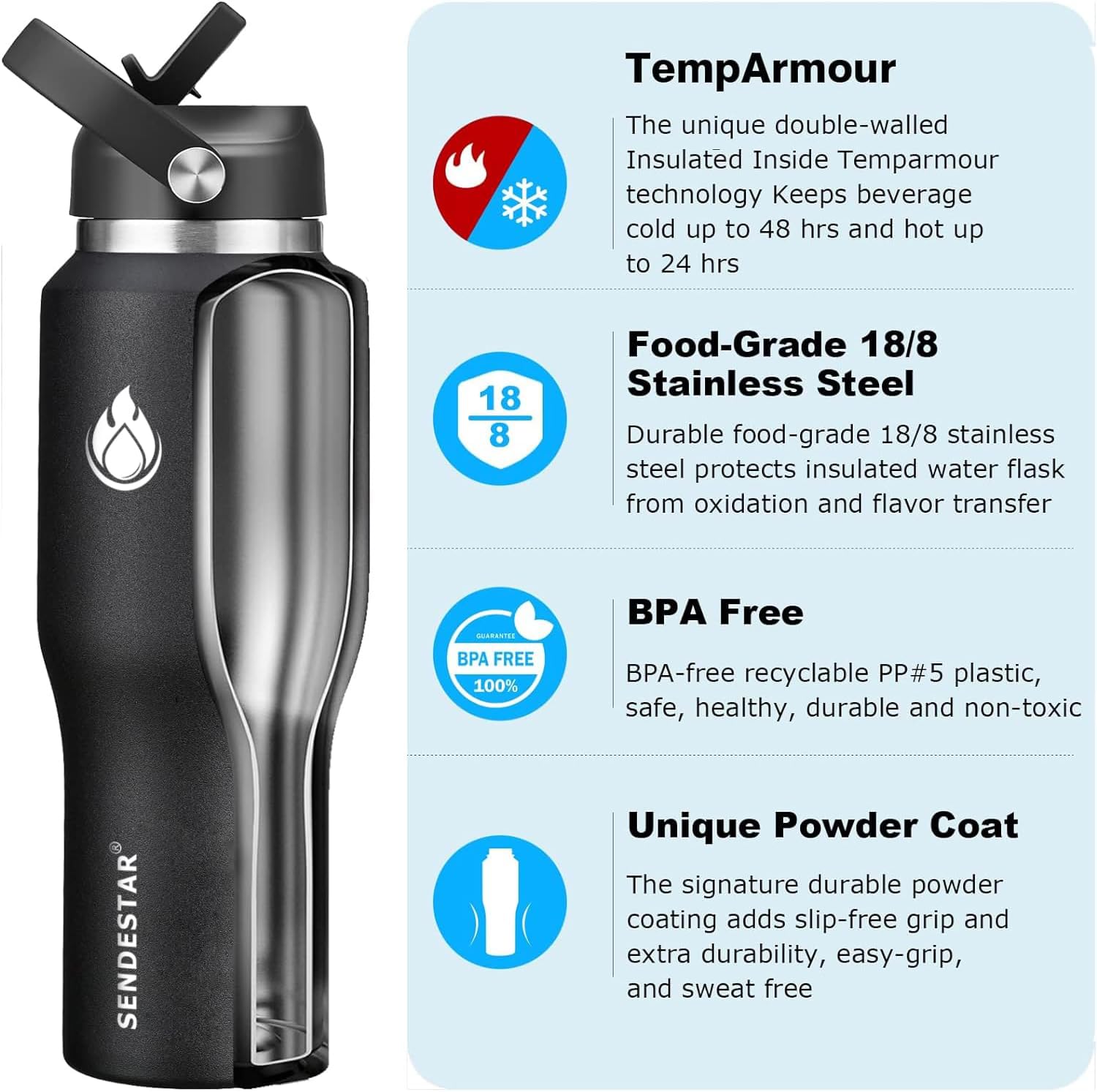 - 【VACUUM INSULATED】 Unique technology inside SENDESTAR 40oz water bottle keeps cold drink icy for up to 48 hours and hot beverage steaming up to 24 hours, make sure your every sip is the feeling you want. Excellent leak proof sealing lid prevents leakage so that you can just grab and go.