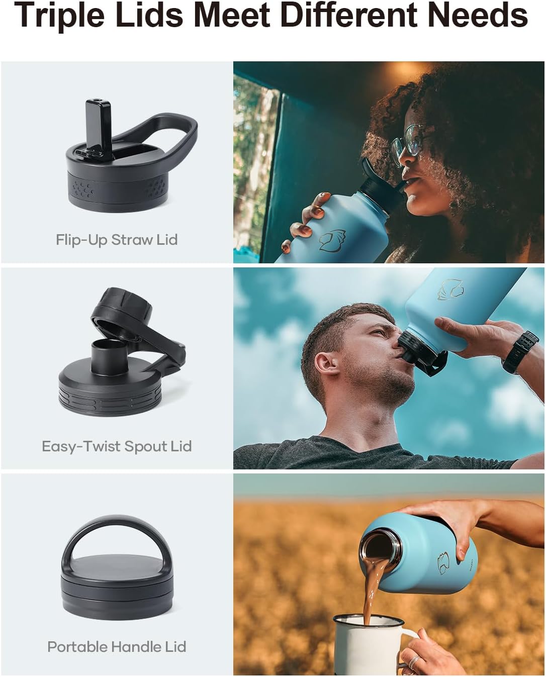 - 3 Caps Pack, 100% Leak-Proof: BUZIO stainless steel water bottle comes with 3 lids: portable handle lid, easy-twist spout lid, and flip-up straw lid to meet camping, hiking, cycling, fitness sports and more. Each lid has a thickened 360° seal for 100% leak-proof.