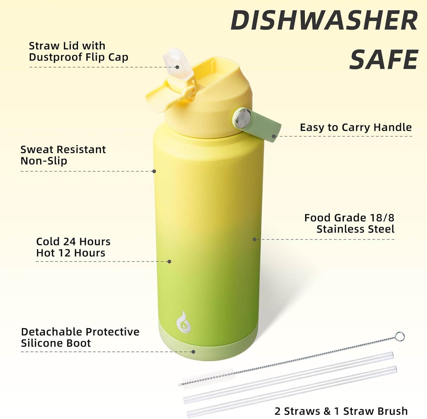 - NON-SLIP PROTECTIVE BOOT & DISHWASHER SAFE: This stainless steel water bottle comes with a detachable silicone boot to protect the bottom from bump damage. The wide mouth design of our water cup allows for easy filling, pouring, and cleaning. With 2 straws and 1 straw brush, you can easily clean the nozzle and straw with straw brush. It is also dishwasher safe, saving you time and effort in maintaining its cleanliness and hygiene