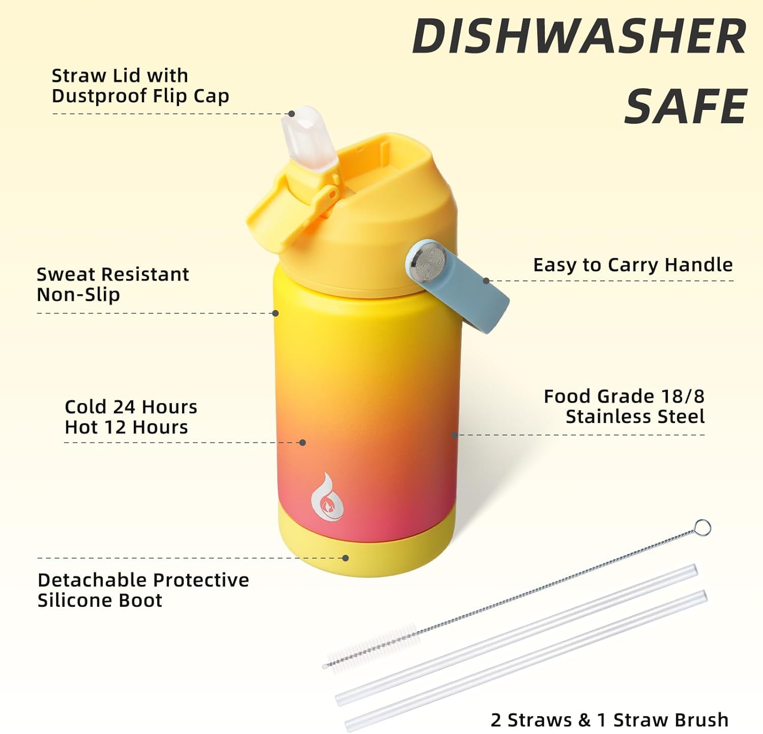 BJPKPK Insulated Water Bottle with Straw Lid, 12oz Thermos Water Bottles with Soft Nozzle, Flex Handle & Non-slip Boot, BPA Free Leak Proof Stainless Steel Metal Thermos, Tumblers, Cups,Rainbow