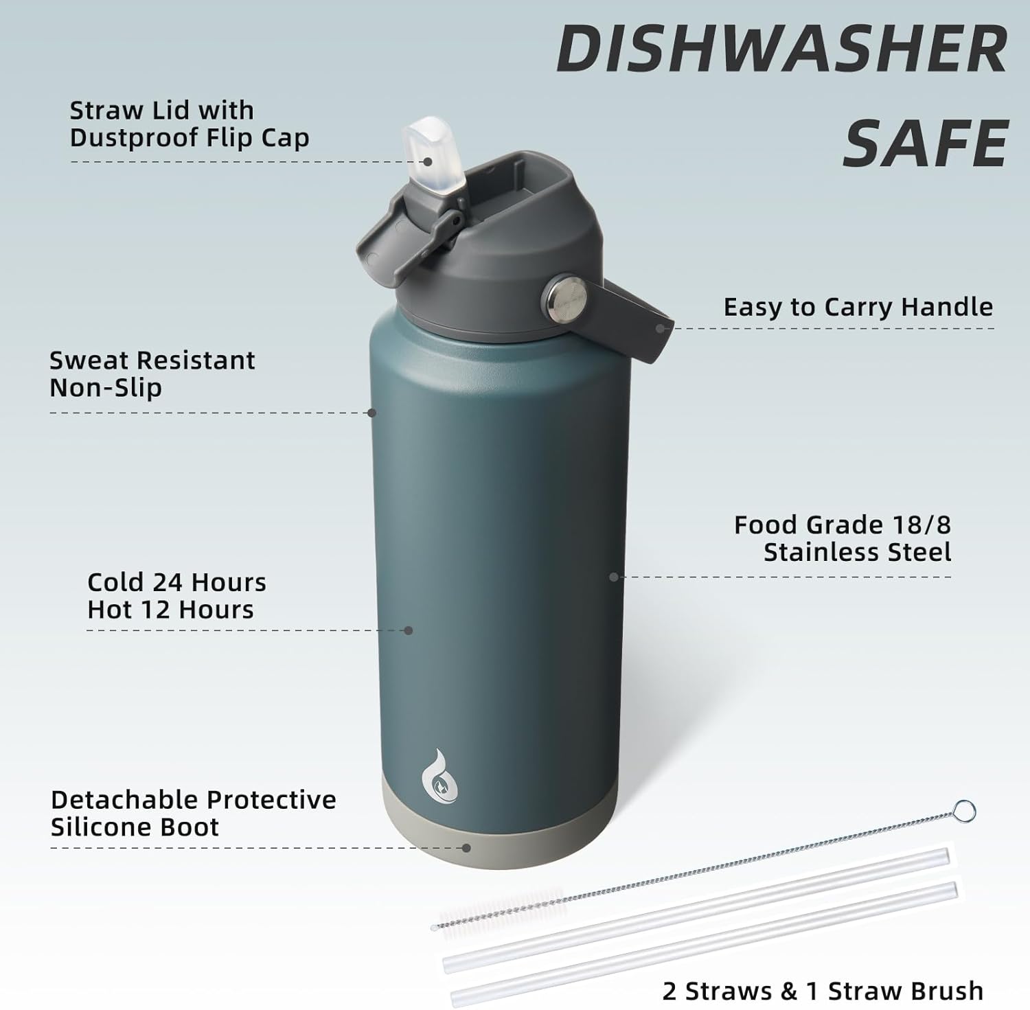 - NON-SLIP PROTECTIVE BOOT & DISHWASHER SAFE: This stainless steel water bottle comes with a detachable silicone boot to protect the bottom from bump damage. The wide mouth design of our water cup allows for easy filling, pouring, and cleaning. With 2 straws and 1 straw brush, you can easily clean the nozzle and straw with straw brush. It is also dishwasher safe, saving you time and effort in maintaining its cleanliness and hygiene