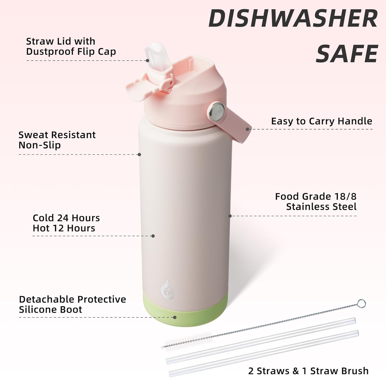 - NON-SLIP PROTECTIVE BOOT & DISHWASHER SAFE: This stainless steel water bottle comes with a detachable silicone boot to protect the bottom from bump damage. The wide mouth design of our water cup allows for easy filling, pouring, and cleaning. With 2 straws and 1 straw brush, you can easily clean the nozzle and straw with straw brush. It is also dishwasher safe, saving you time and effort in maintaining its cleanliness and hygiene