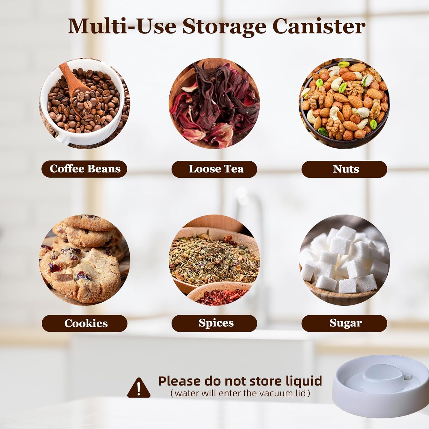 - ✅【Real Freshness Keeper】 Only vacuum can really keep fresh!Our vacuum seal canister press just one button to remove air to prevent oxidation and keep fresh five times longer. Perfect for coffee beans, coffee grounds, loose tea, spices, candy, nuts,dog food and other dry food.