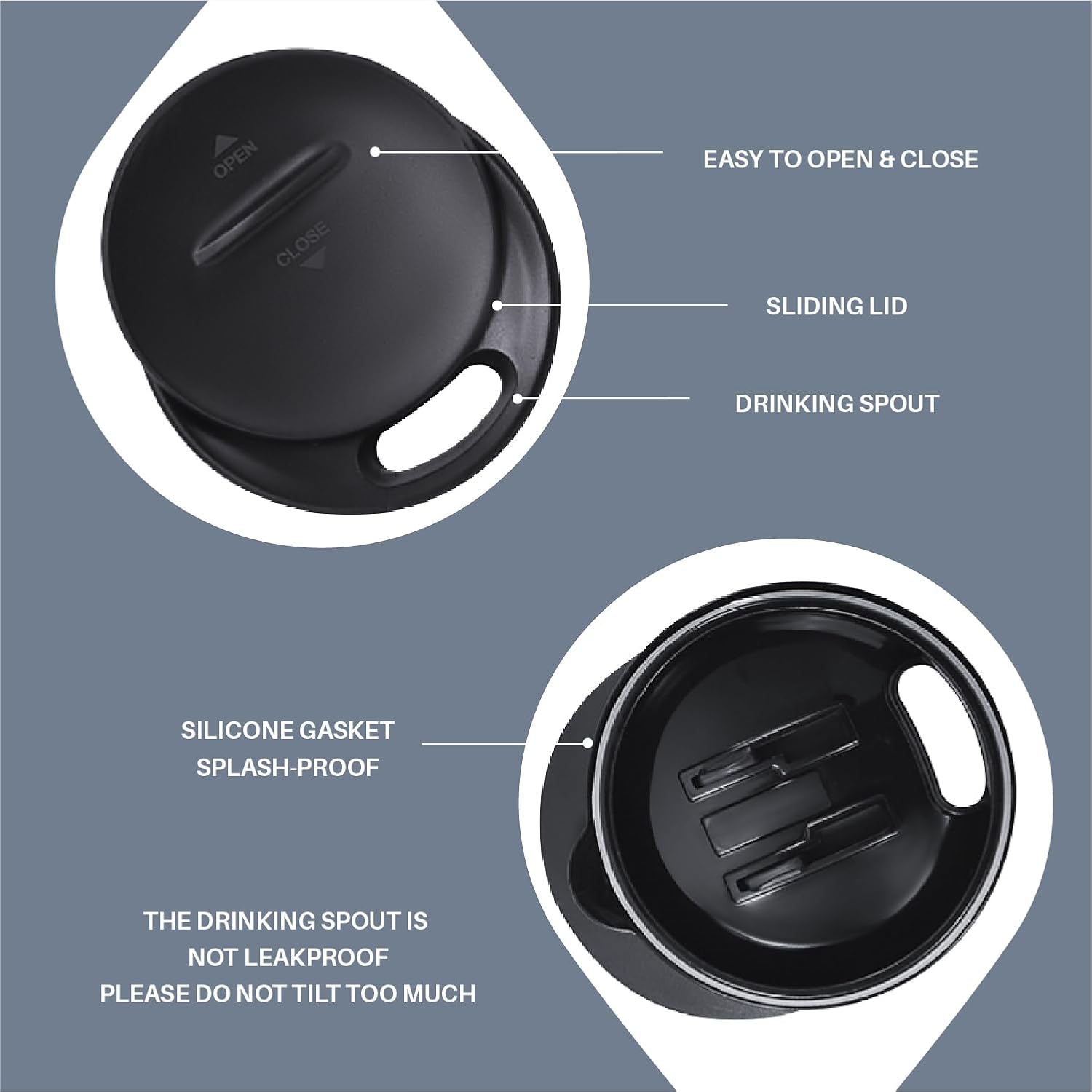 - 【PRESS-IN LID】- Silica gasket seals to achieve maximum spillproof capability. Drinking hole on the top, with a splash-proof sliding cover. Please note it is to keep drinks contained and prevent heat/cold from escaping. It is not leakproof.