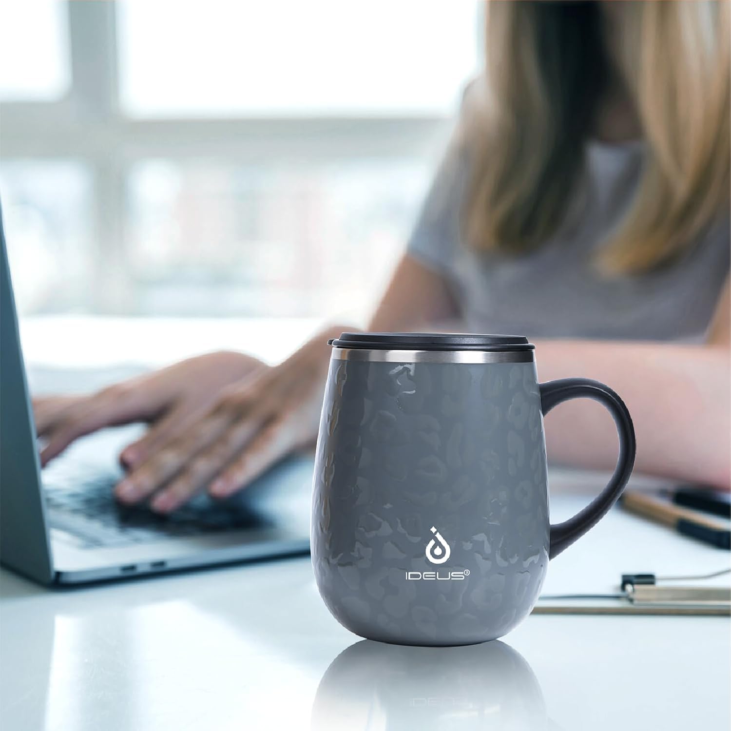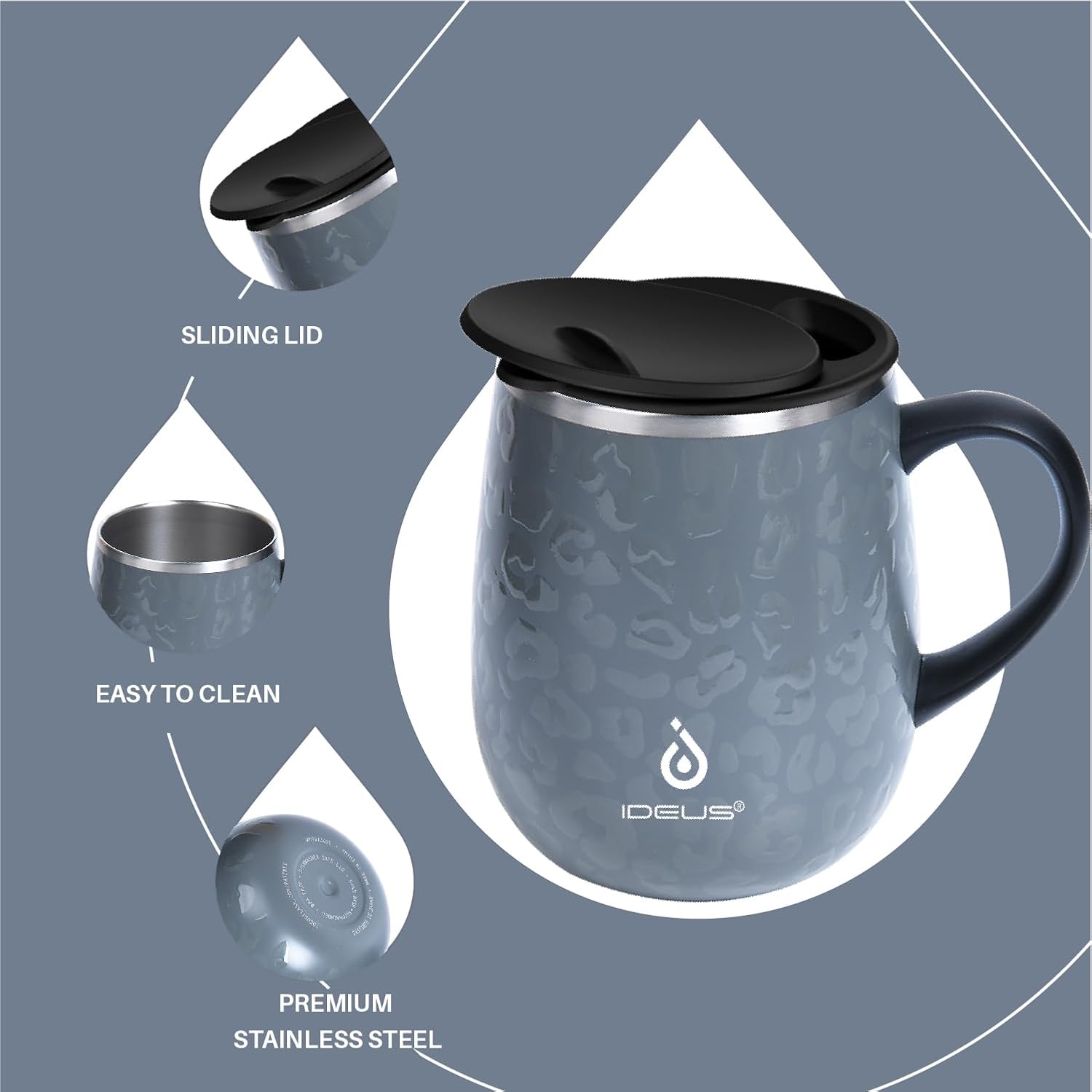 Ideus 16 oz Insulated Coffee Mug with Handle and Lid, Double Wall Stainless Steel Vacuum Thermal Coffee Mug, Travel Coffee Cup Thermal Cup for Home and Office, Leopard Gray
