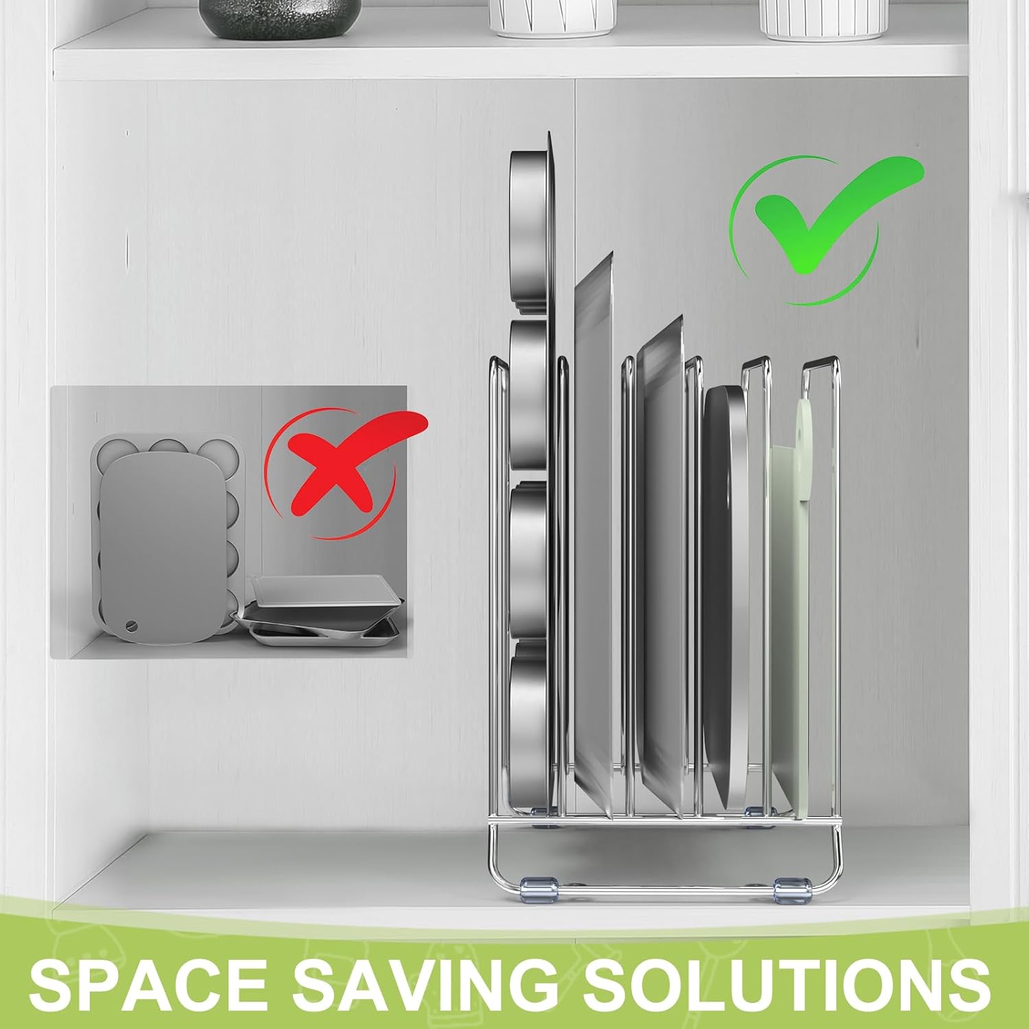 - 【SPACE SAVER】 This cutting board organizer can be put either on your kitchen countertop for daily use or in cabinet to organize to organize cutting boards and bakeware, keep everything organized and tidy, saving valuable kitchen space.