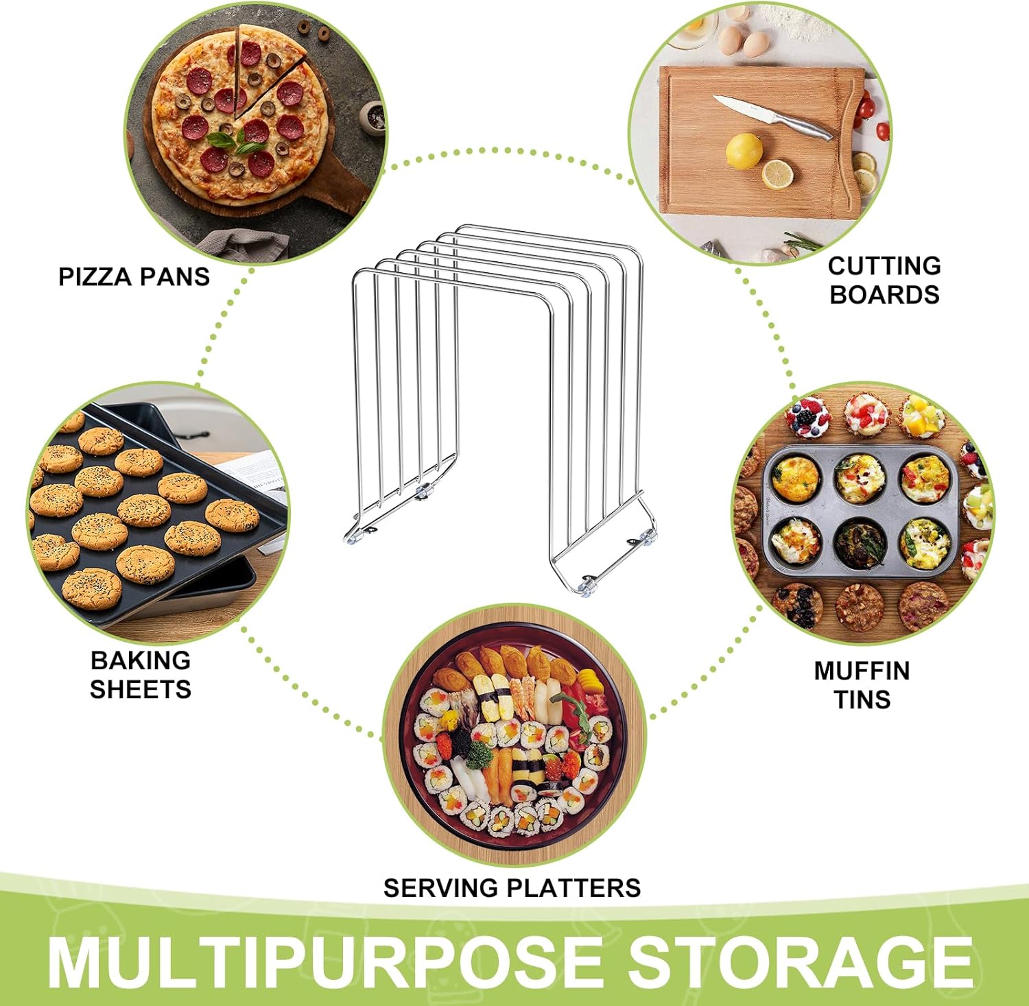 - 【VERSATILE DESIGN】 This rack is designed to hold and organize different kinds of kitchen stuff, can be used to organize cutting boards, bakeware, cookie sheets, pans. It can be also used in your home office to organize office items.