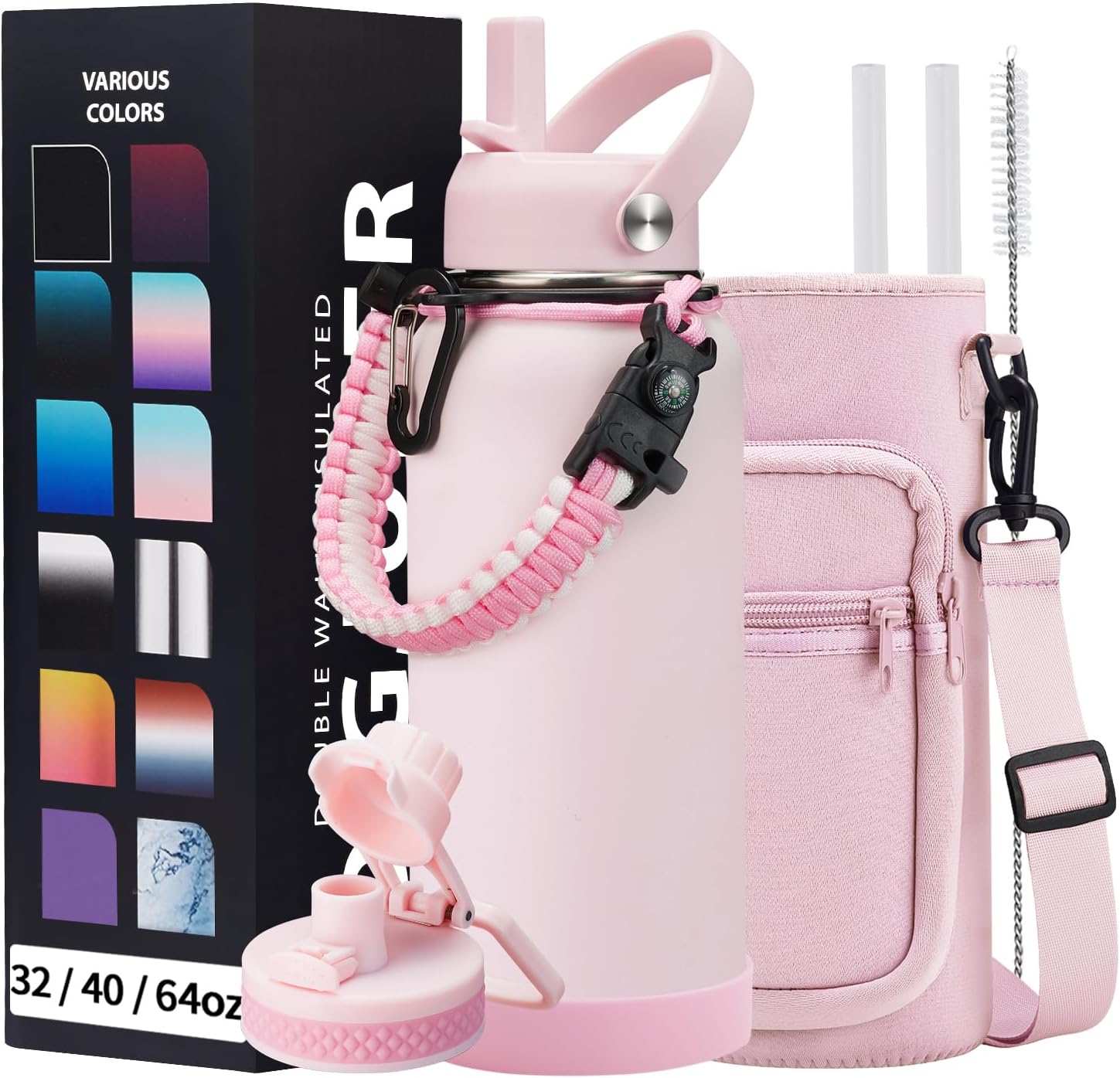 - SUPER JOYFUL COMBO: Buy 32oz insulated water bottles and get 9 accessories (2 x lids, 1 x survival paracord, 1 x carrying pouch, 1 x shoulder strap, 1 x protective cup mat, 2 x straws, 1 x straw brush). WITH A LIFETIME GUARANTEE, these thermal water bottles are perfect gifts for using at home, work, school, road trips, hiking, sporting events, or just hanging out