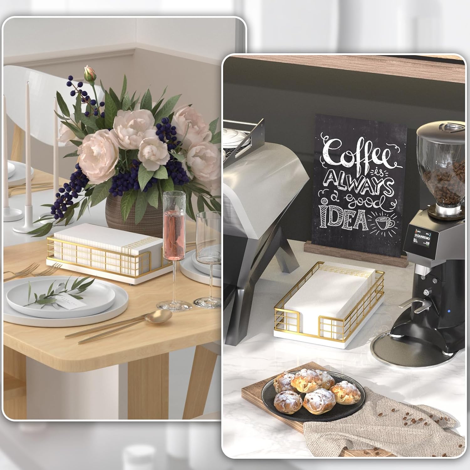 Wican Guest Towel Holder Tray for Bathroom, Oak and Iron Napkins Holder for Powder Room Dinning Table Wooden Basket for Disposable Paper Hand Towels Gold and White