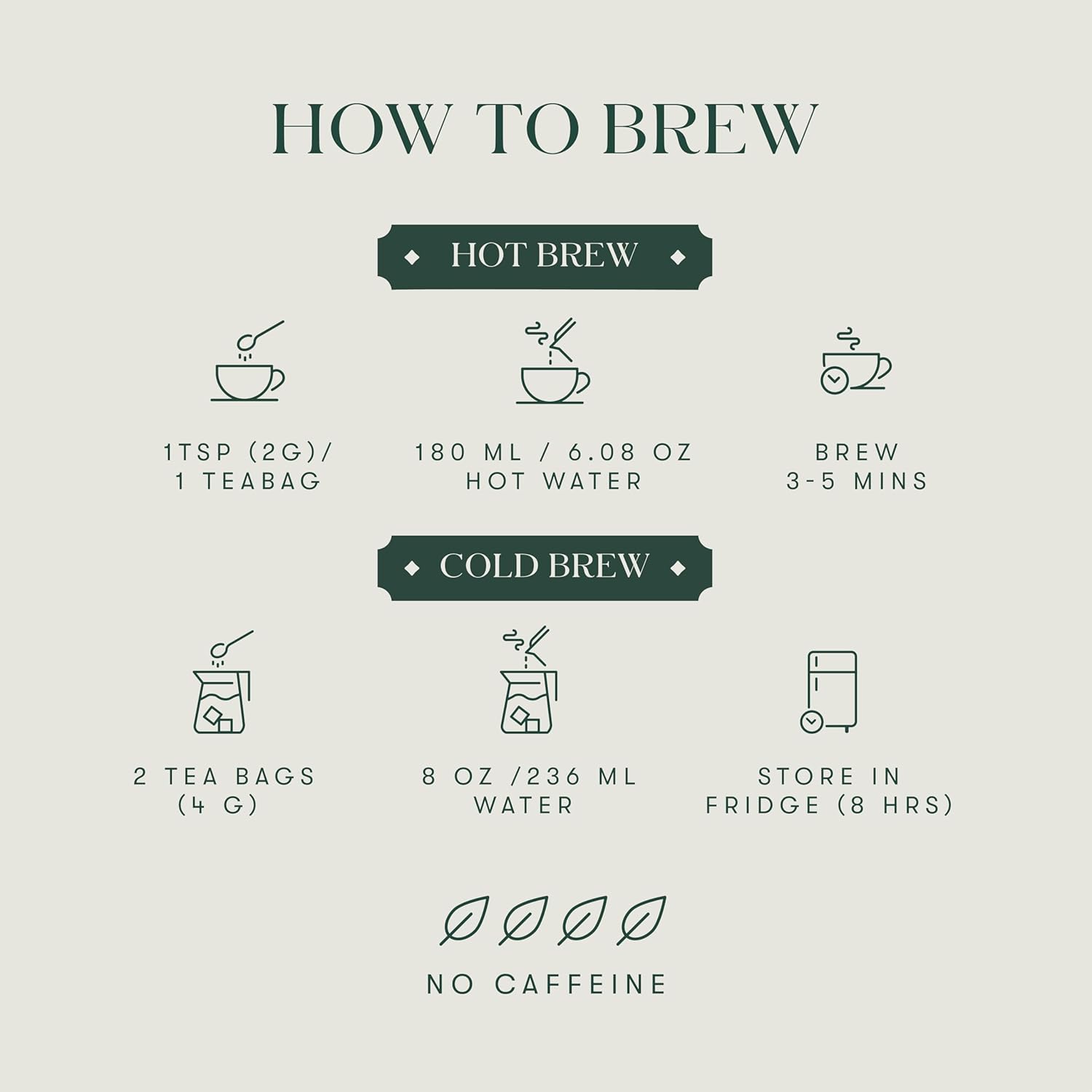 - BREW IT RIGHT - HOT BREW: Add 1 teabag/ 2g of tea to a cup of filtered water. Steep for 3-5 minutes. Remove the tea bag or strain the loose leaf. COLD BREW: Steep 2 teabags/ 2 tsp tea in your cup for 8-10 hours or overnight, add ice and enjoy your iced cold brew! Enjoy your calming cup of Sencha Tea.