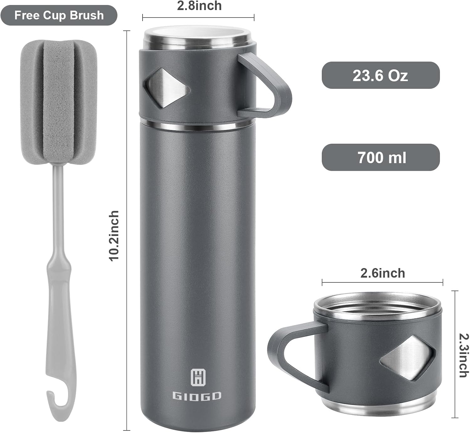 Stainless Steel Thermo 700ml/23.7oz Vacuum Insulated Bottle with Cup for Coffee Hot drink and Cold drink water flask.(Gray,Set)