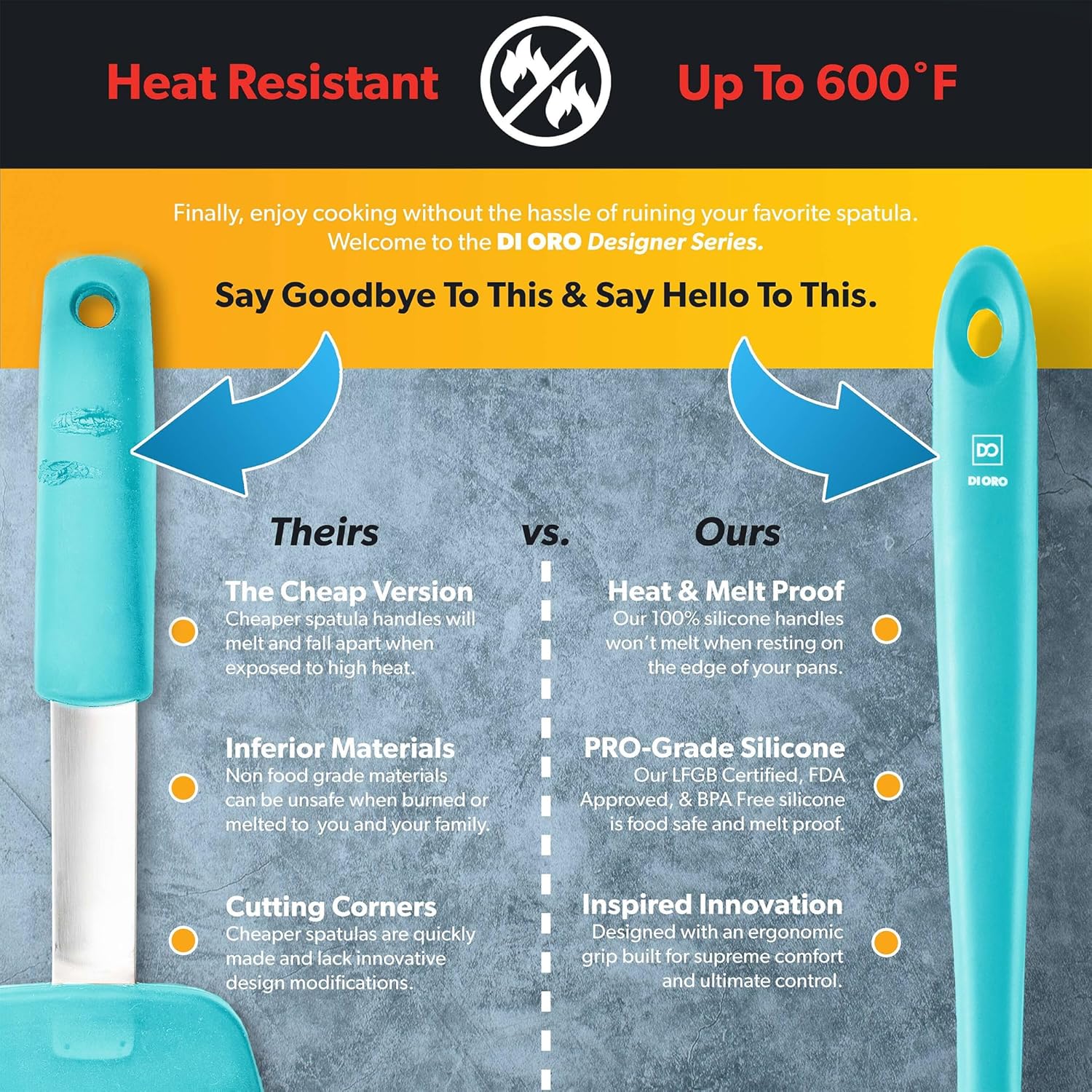 - ONLY THE BEST – By popular demand, we have added a Silicone Ladle to our Award-Winning Seamless Series line of kitchen utensils. The Di Oro Seamless Series Ladle is made with food grade, BPA Free, and LFGB Certified Silicone. Built to withstand the heat, this ergonomically designed tool is heat-resistant up to 600°F, which means you will never melt your favorite kitchen utensil.