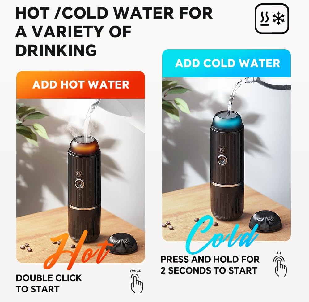 - Warm Tips: The coffee maker's performance may vary slightly when the battery capacity is low. Therefore, it is essential to remember to charge it before embarking on long travels to ensure continuous usage.