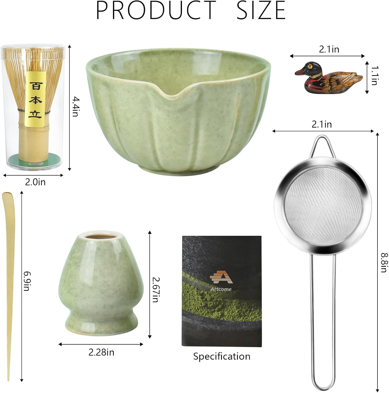 - COMPELETE SET: Matcha whisk, tea scoop, a matcha bowl with a pouring spout, a whisk holder, a scoop holder, a matcha powder strainer and matcha tea manual.