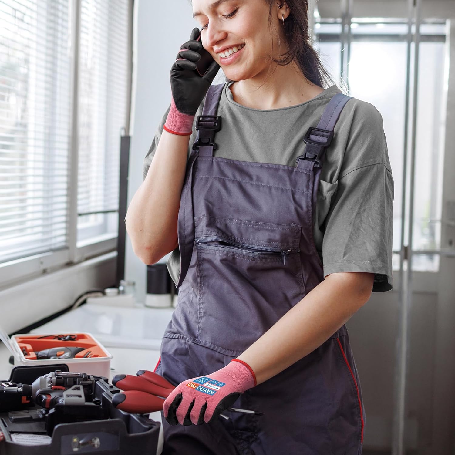 KAYGO Safety Work Gloves PU Coated for Men and Women- KG11PB,12 Pairs,Seamless Knit Glove with Two Fingers Touchscreen,Ideal for General Duty Work (Small,Pink)