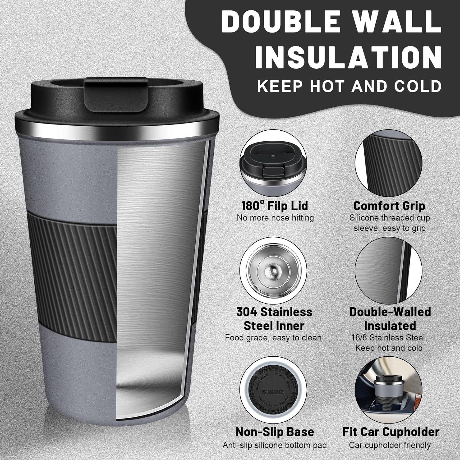- Easy Clean & Comfort Grip: The large-opening design make insulated coffee tumbler mug easy to clean, the travel coffee mug comes with an eco-friendly one-hand flip-top snap, spiral silicone sleeve for easyily carry out, makes drinking with one hand comfortable and secure, sealing silicone strip and a screw lid design to prevent spills.