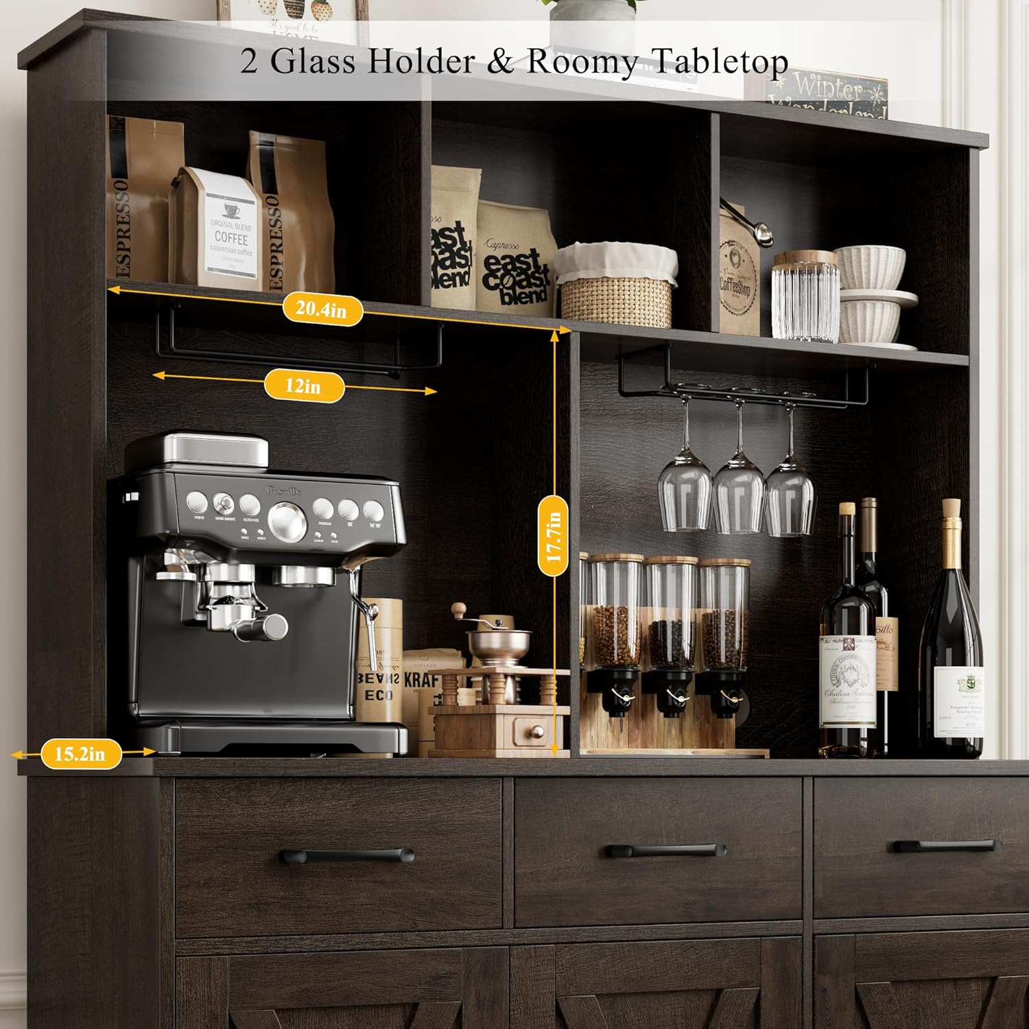 HOSTACK Buffet Cabinet with Hutch, Modern Farmhouse Kitchen Buffet Sideboard Storage Cabinet with 3 Drawers, Barn Door Coffee Bar Station for Dining Room, Living Room, Dark Brown