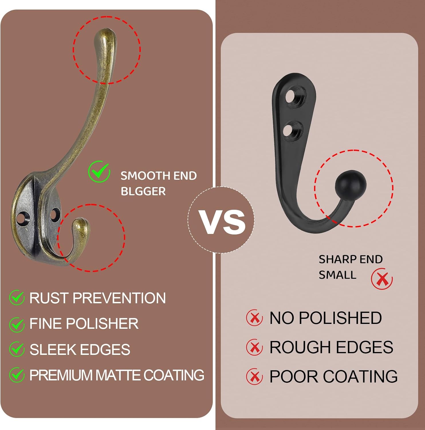 - 【Package and Size】closet hooks Set includes 10pcs double coat hooks and 20pcs screws Measures 3.9 inches*2.2 inches*1.2 inches.