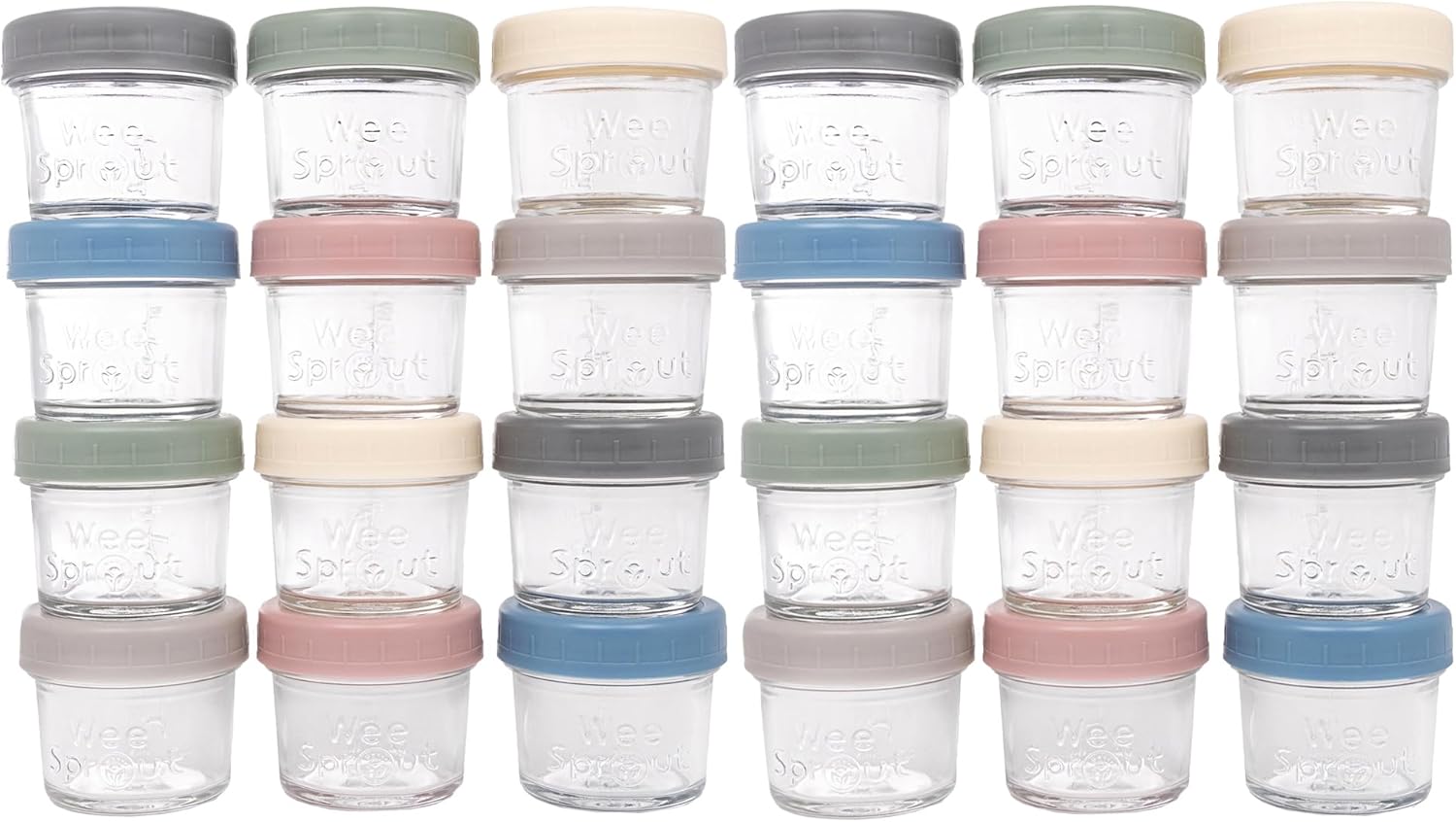WeeSprout Baby Food Storage Glass Jars w/Lids (4 oz, 24 Pack) Matte Variety, Snack, Reusable Small Containers, Fridge or Freezer, Microwave & Dishwasher Safe, Essentials for Infants