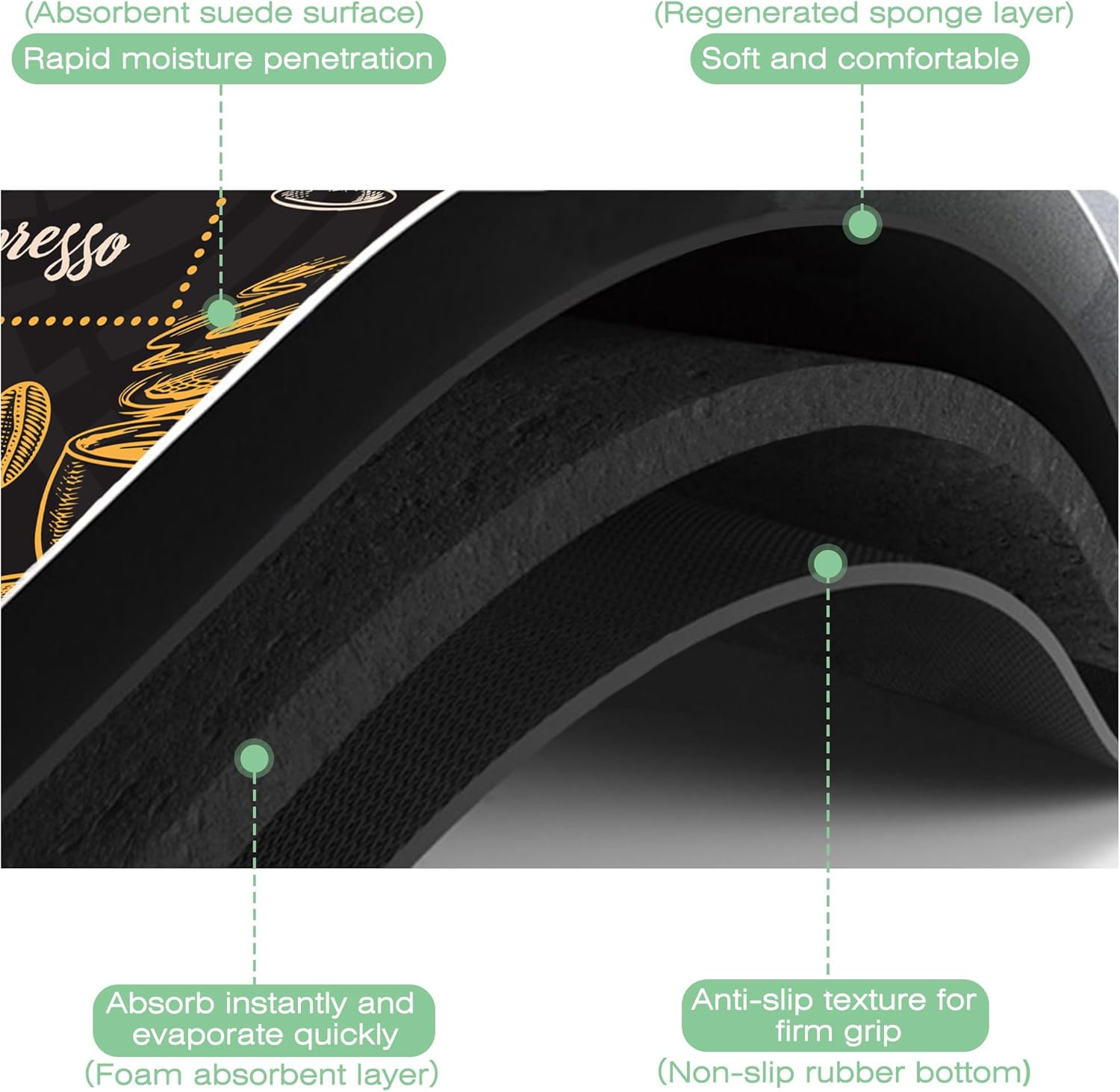 - 【Hide Stains & Easy to Clean】Our coffee drying mat, surface material up to 85% porosity can quickly absorb stains. The countertop coffee bar mat can be cleaned by hand or machine to remove stains, will not fade after repeated washing, can be reused many times, due to the high-definition printed suede with excellent color locking effect, please do not use bleach to clean the mat.