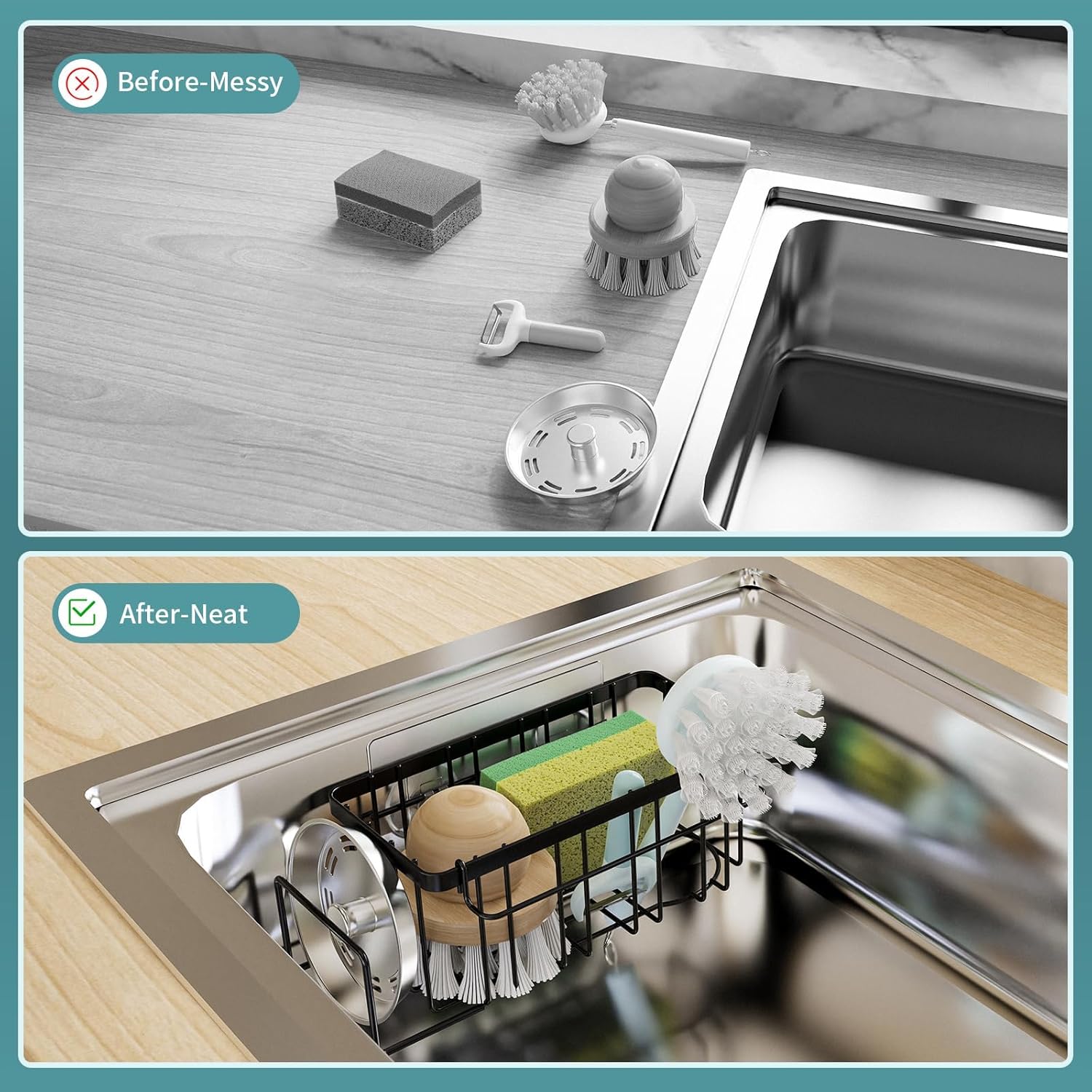 - 【Two Installation Options】Provides two installation options for the sponge holder for kitchen sink, adhesive hooks and suction cups, so that no drilling is required. Adhesive hook provides good stability, and suction cups allow for easier removal. Installation instruction will be included with the sink caddy. Please clean the contact surface completely before installation.