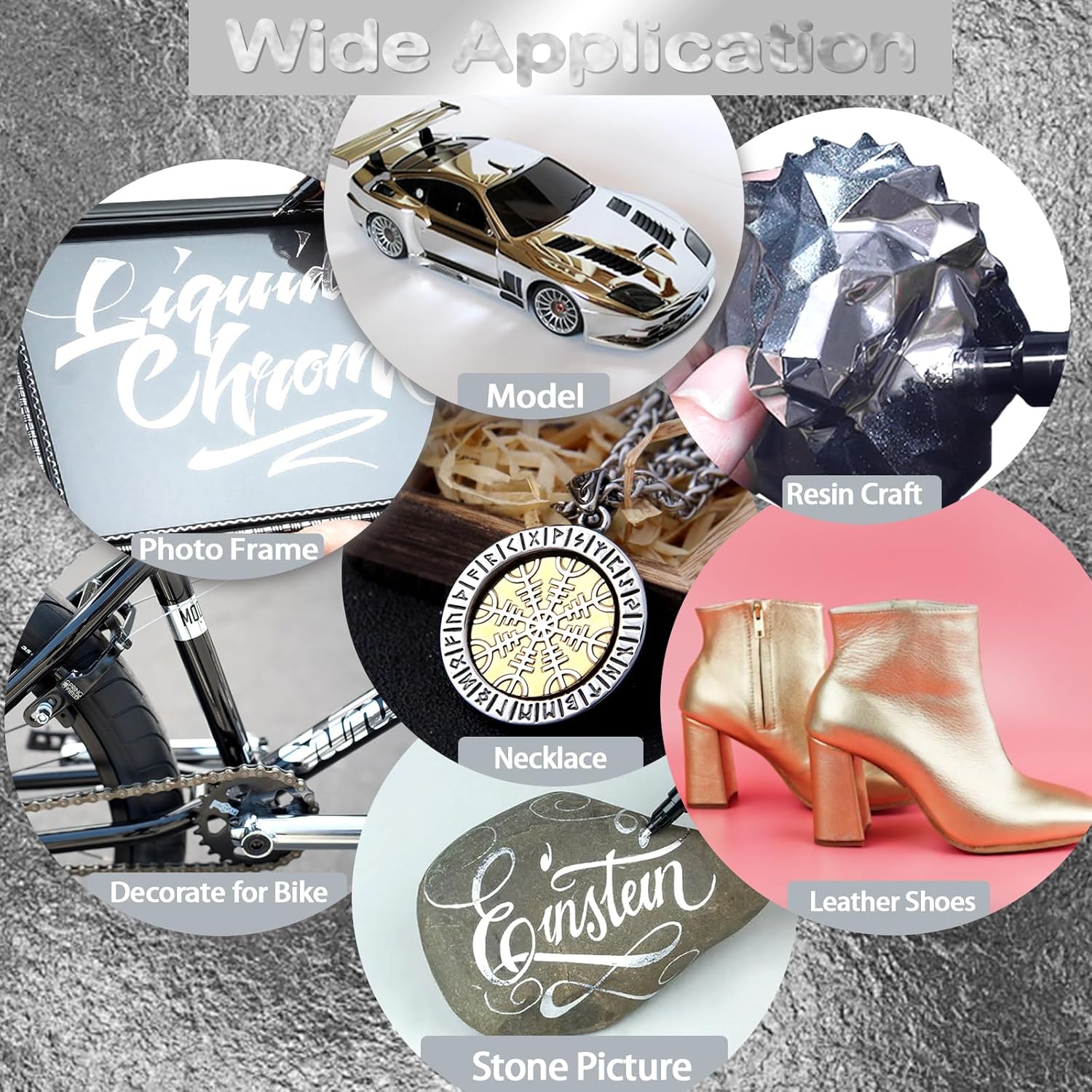 - Wide Applications &Professional Metal Repairs - Dual tip chrome paint pen are suitable for craft making, model painting, personalized writing, card making, painting and graffiti. Chrome pen marker show a bright metallic sheen on resin molds silicone,mirror, paper, plastic, glass, wood, ceramic, and metal. And chrome markers can be used to apply in jewelry making, accurately restore chrome in automotive Logo, car wheel and furniture restoration. Metallic pens is suitable for creative design and professional restoration.