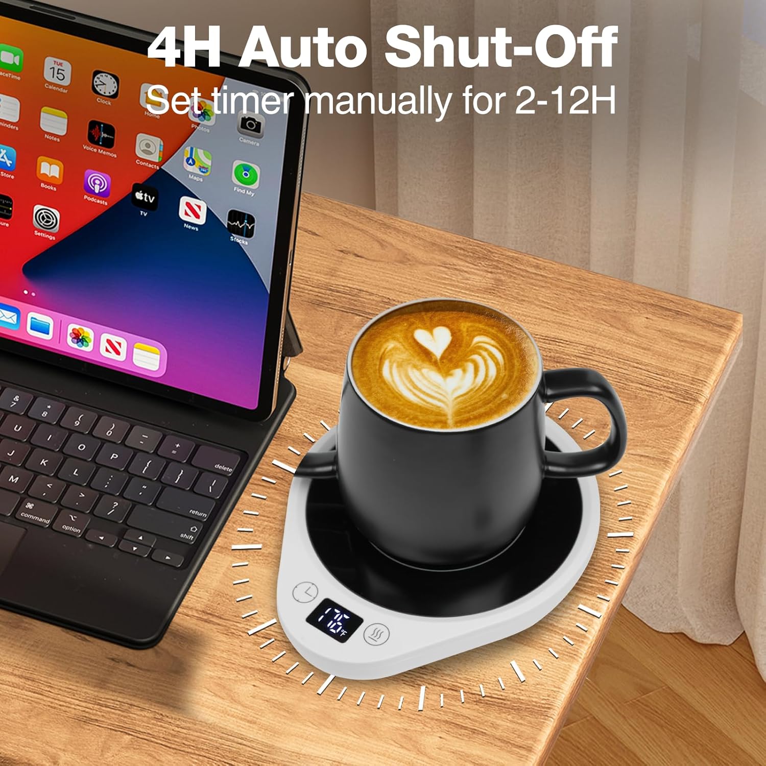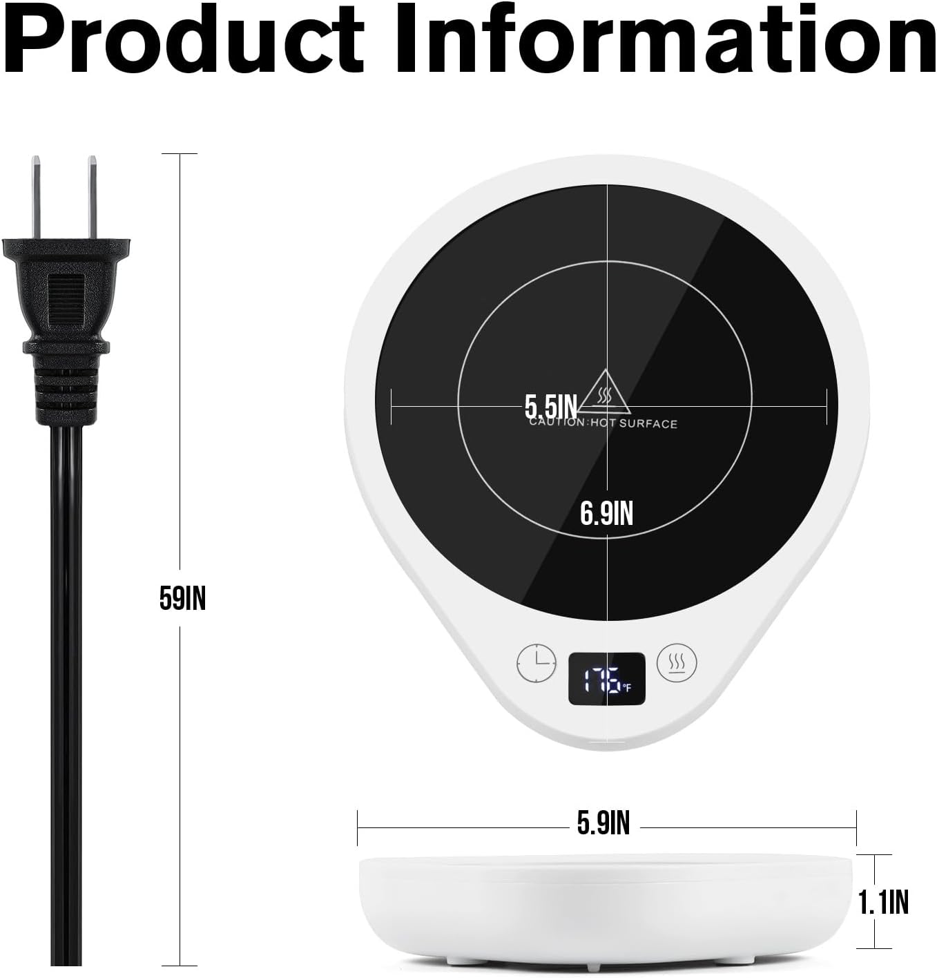 - [4 Hours Auto Shut Off]-This smart mug warmer default setting is auto shut off after working 4 hours. Need't worry about forgetting to turn it off. You can also set the auto-off time as you like (2H,4H, 6H, 8H, 10H, 12H). The LED display shows the time off intelligently and clearly. You can also turn it off manually. 1.5M/59IN charge cord makes it perfect warmer for office desk, home, kitchen, dorm and more.