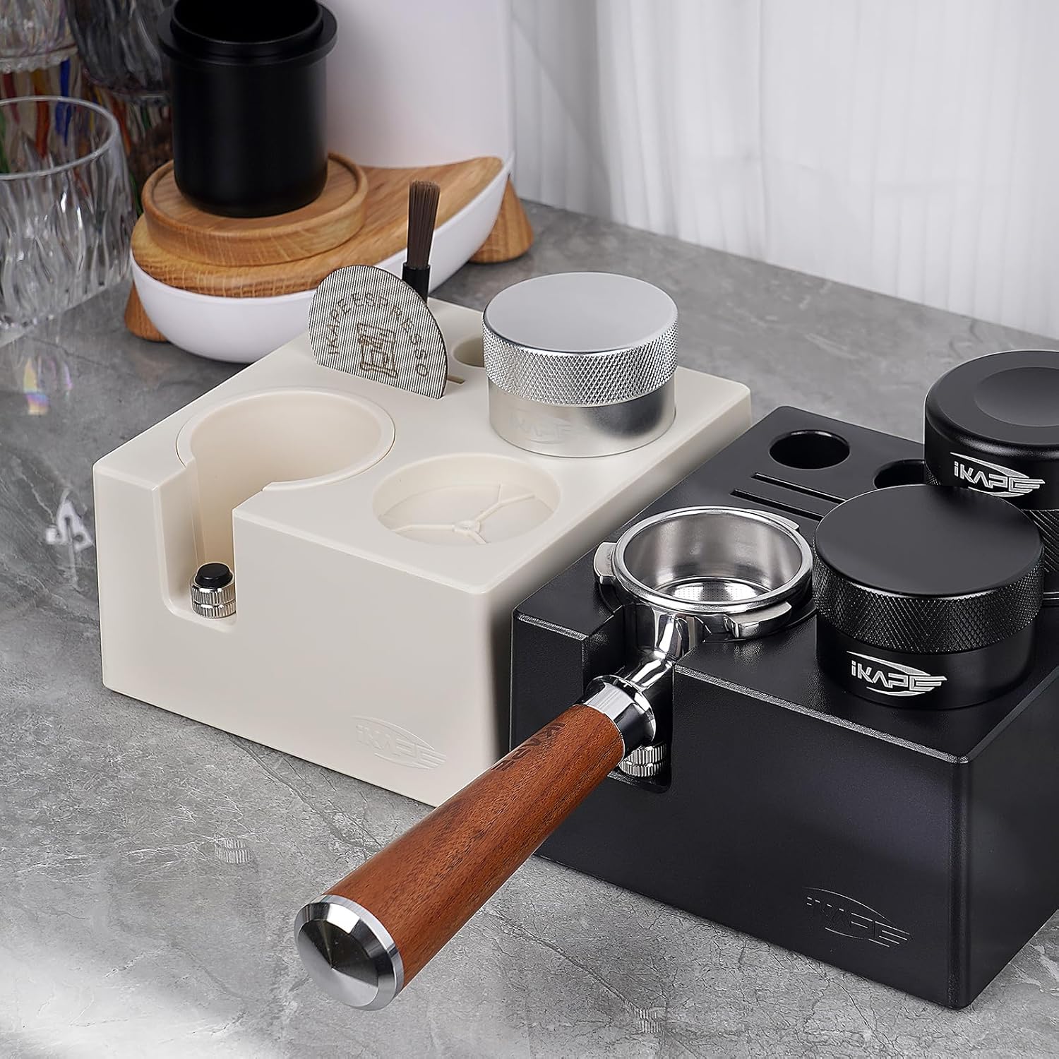 - 7-in-1 Multifunctional Design - IKAPE ABS espresso knock box, it is not only compact, but also has 7-in-1 multi-functional storage space, whether it's tamper, distributor, portafilter, puck screen or cleaning brush, this espresso coffee organizer box can be perfectly stored. It is customized for coffee accessories from 51-58mm in size, and makes it easy to distribute and tamp the coffee powder